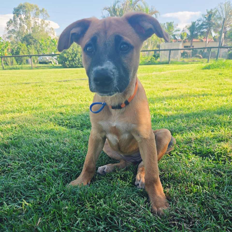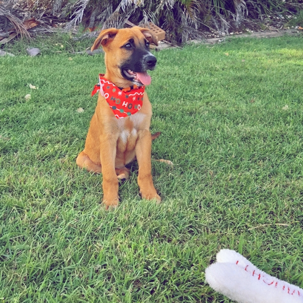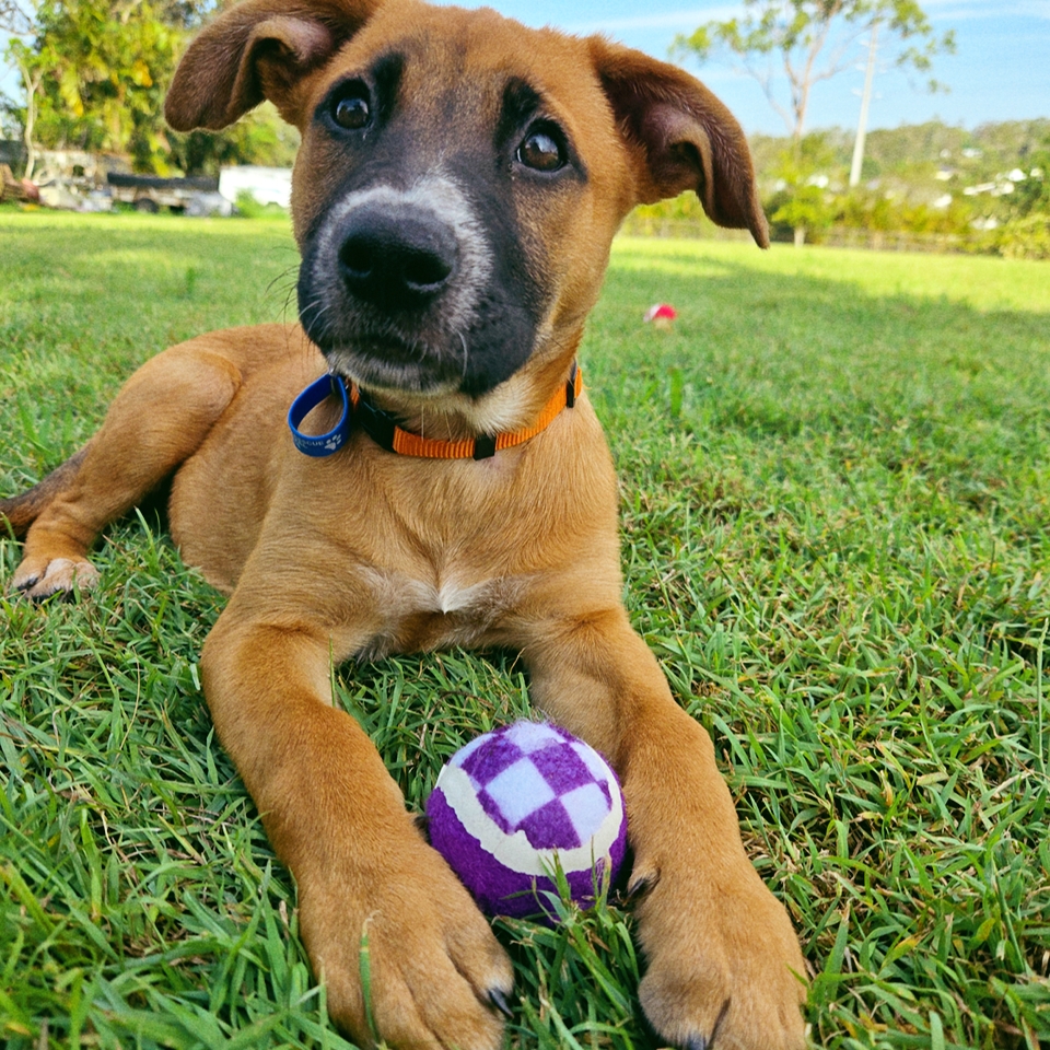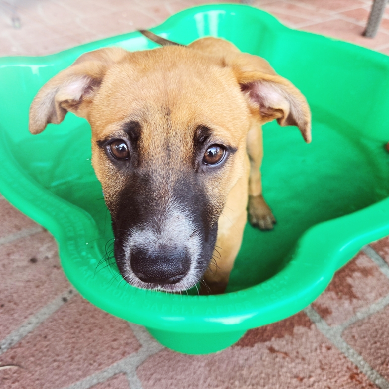 Caye is a super sweet, friendly pup, greeting everyone with a wagging tail and sparkle in her eyes. She is always ready for a scratch behind the ears or a cuddle and loves other dogs and all humans. She also loves water and can often be found splashing in the water bowl or the puppy (kiddy) pool.