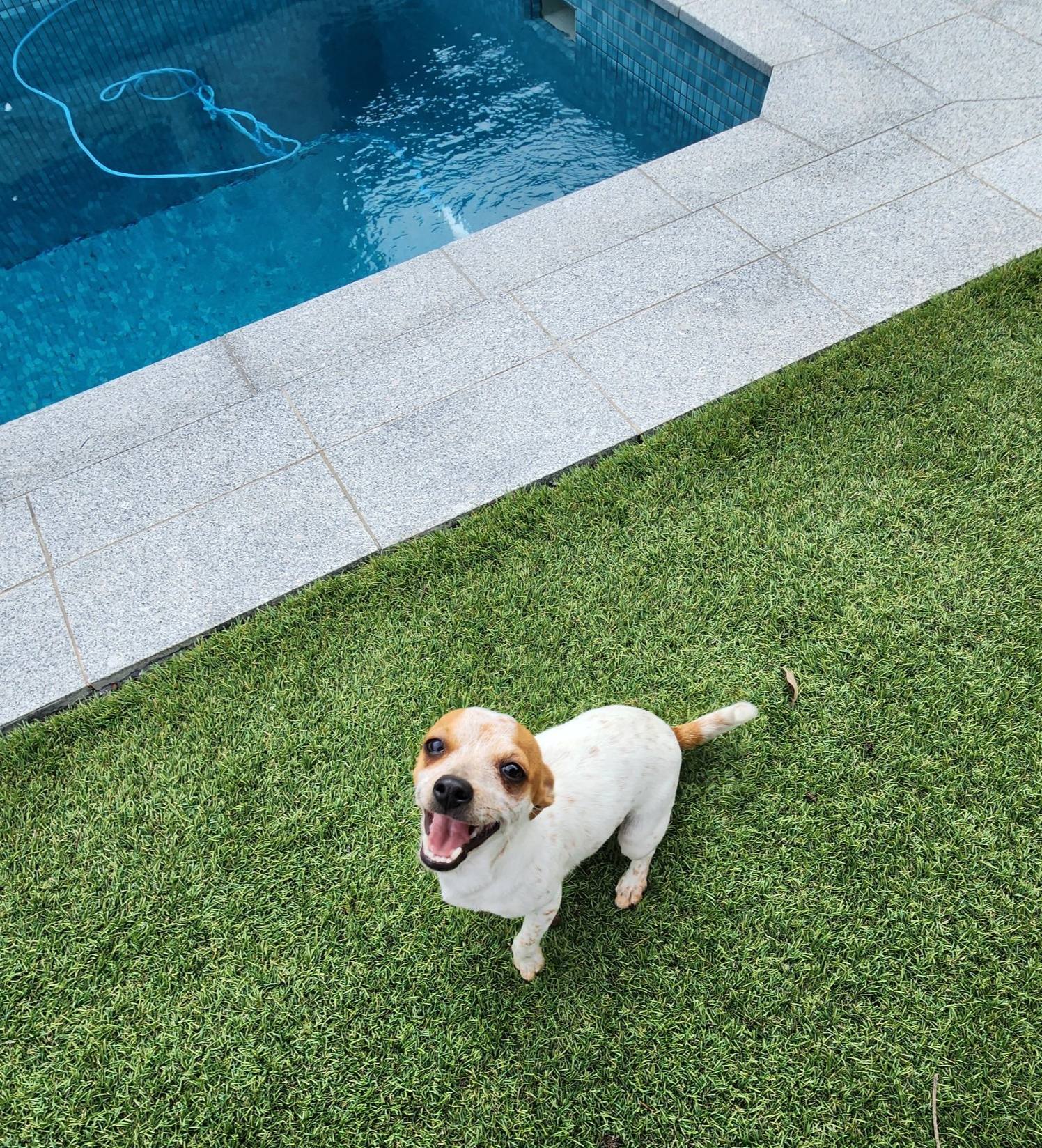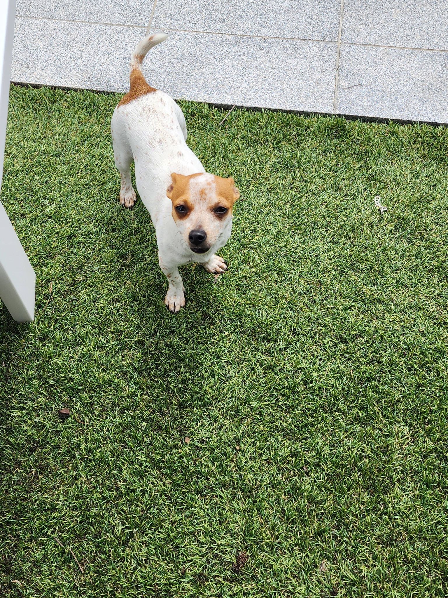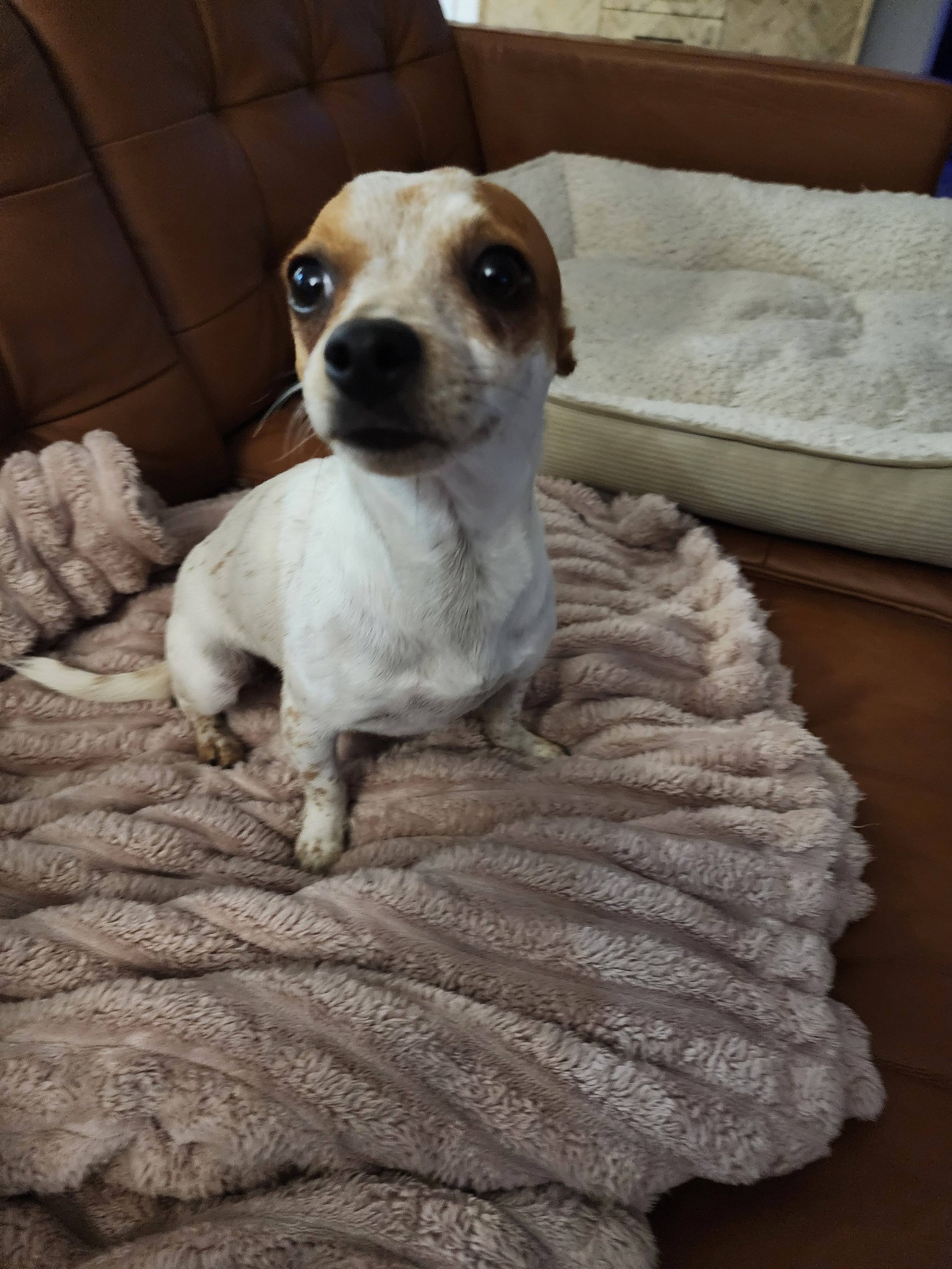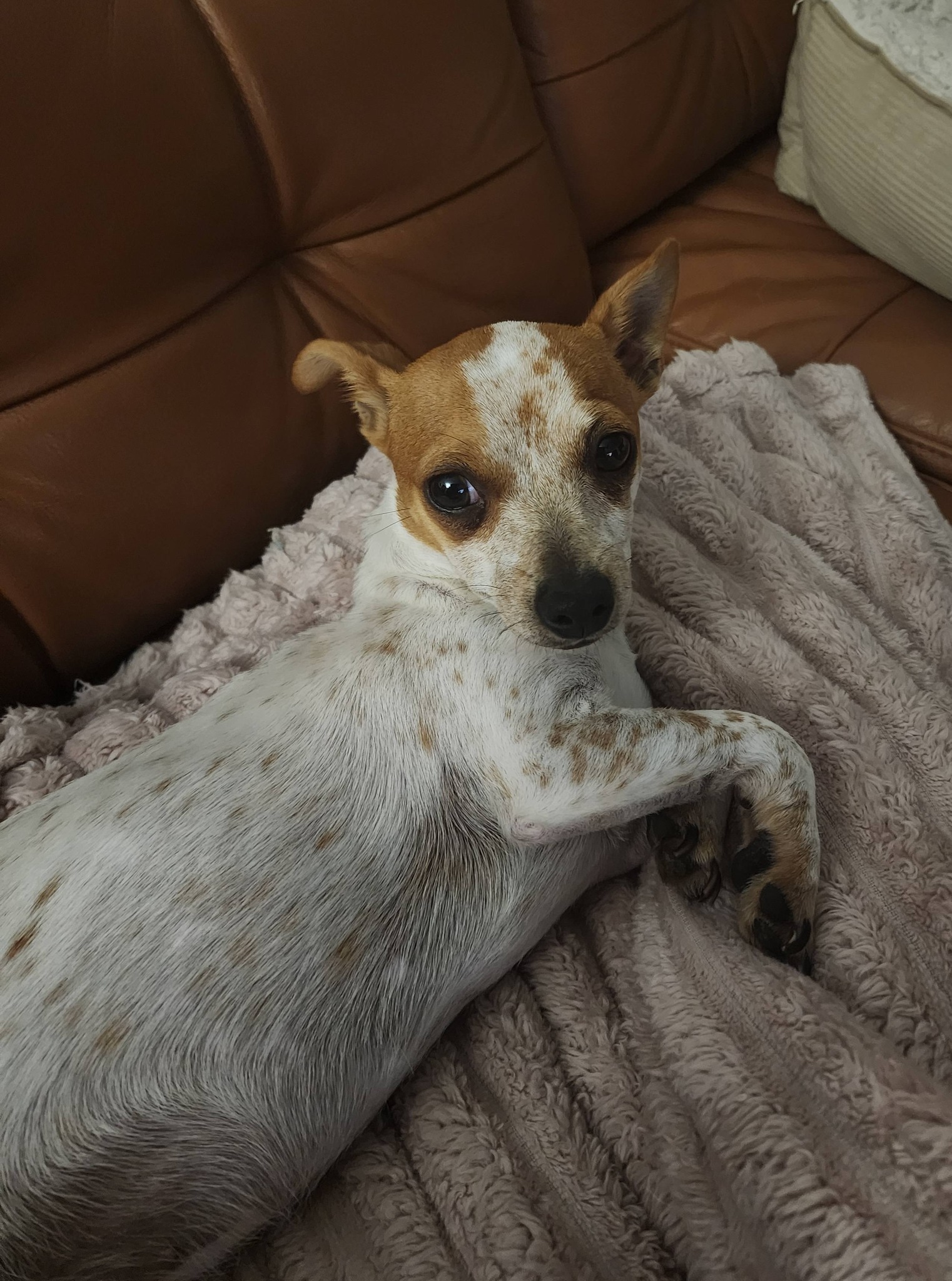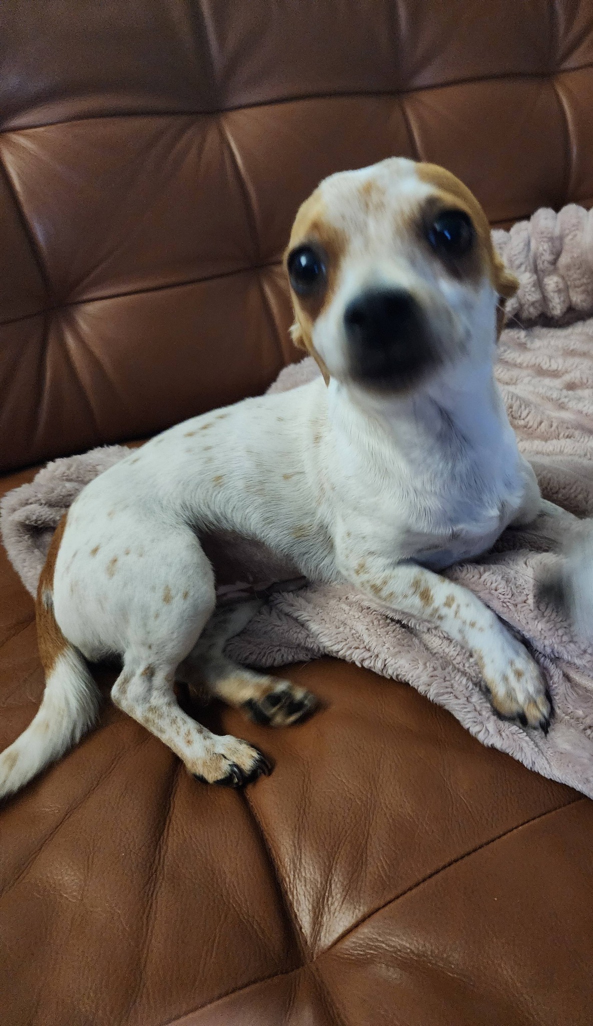 Edith is living with 3 male Jack Russells at her foster home. She lays calmly with them but she is more focused on the humans than the dogs. She would suit a home as the only dog but would prefer humans home most of the time. She could also live happily with another small, calm dog.