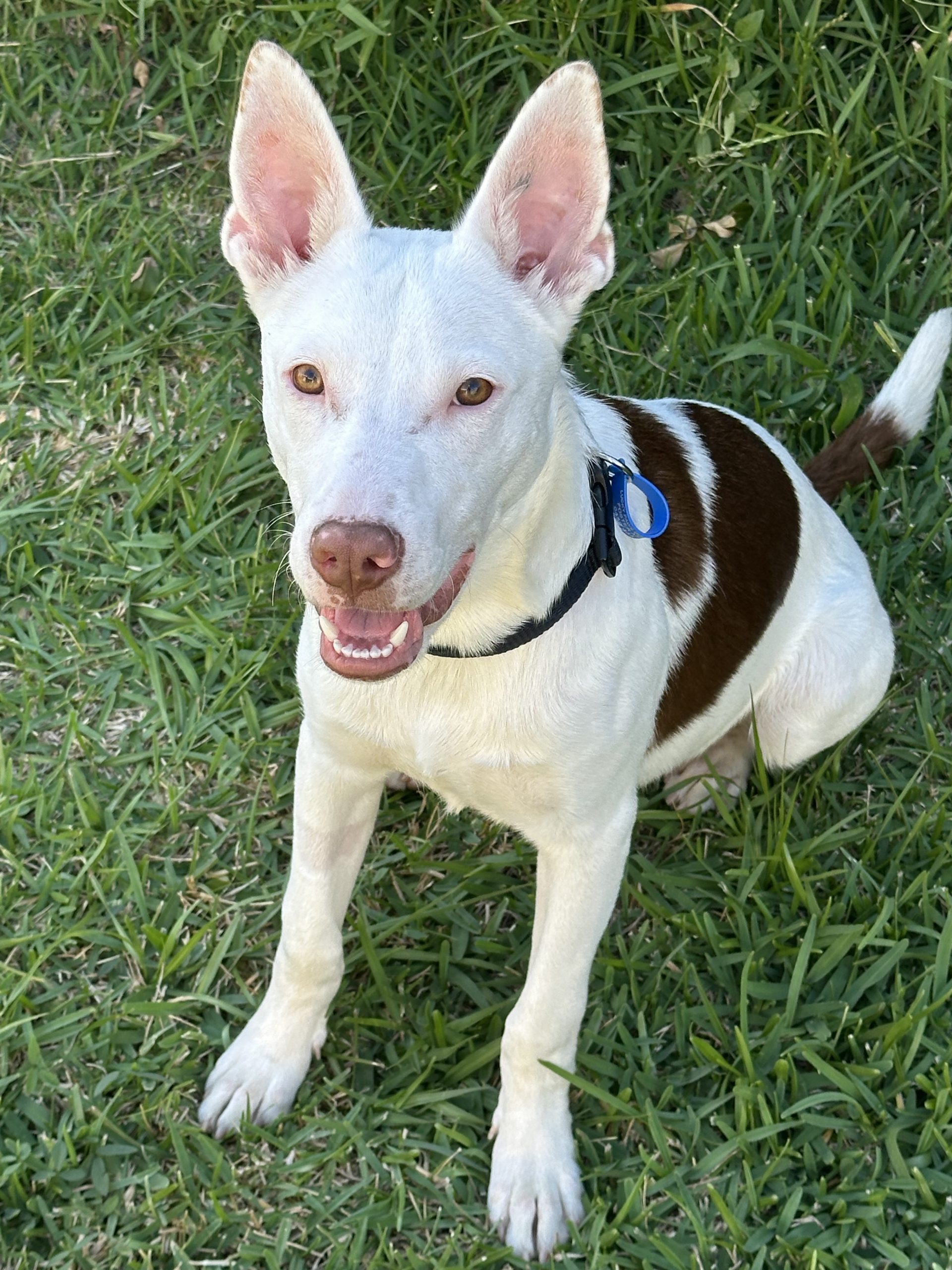 He would be happy with another energetic dog to run around with but also happy as an only dog as he is happy to rest while you are busy or run around the yard and entertain himself with his toys while waiting for you to play ball with him! He also does well being at home by himself.