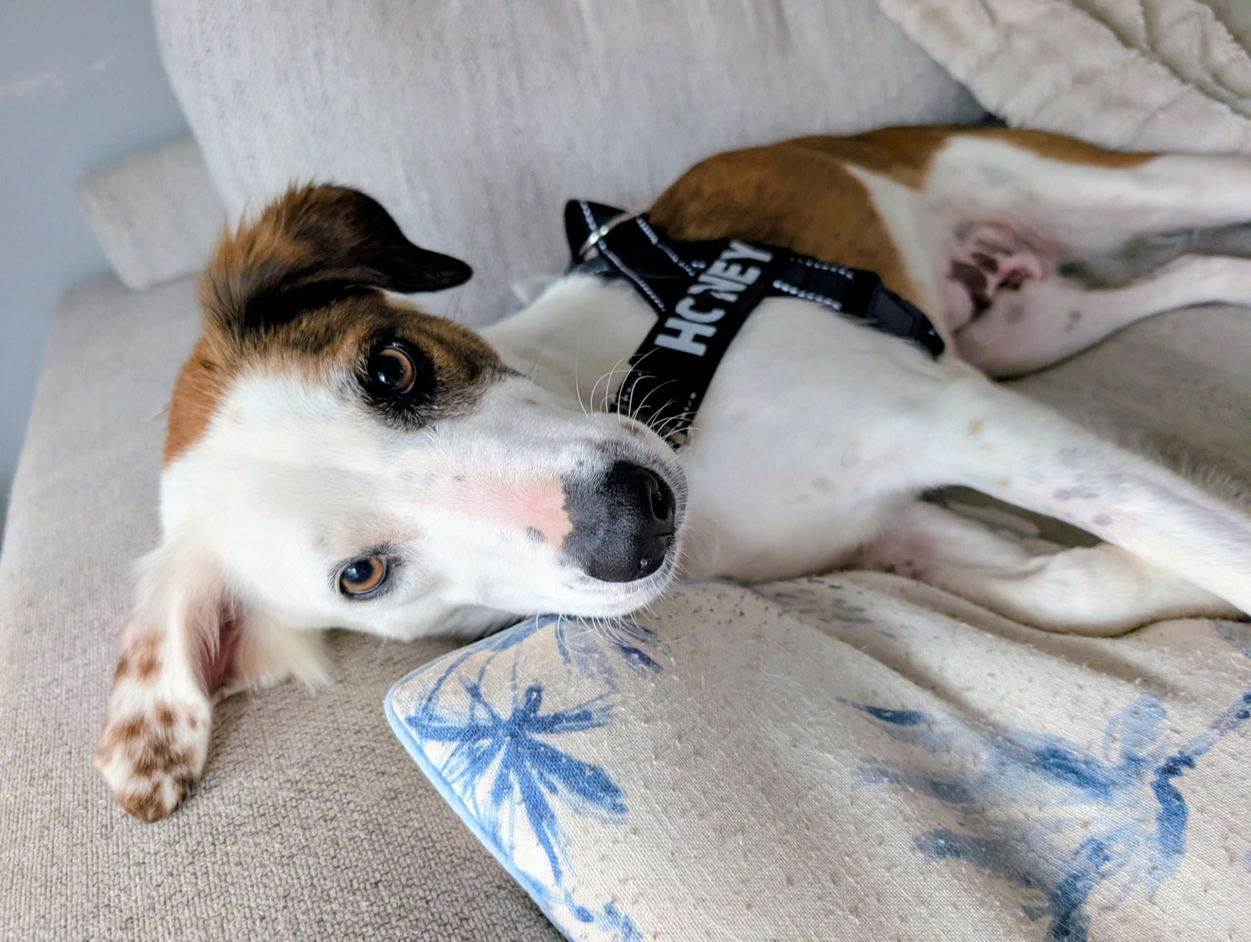 Recently, Honey was diagnosed with heartworm and has begun treatment. She is currently on strict rest for the next month, but this suits her perfectly. She loves lounging, relaxing, and watching the world go by.