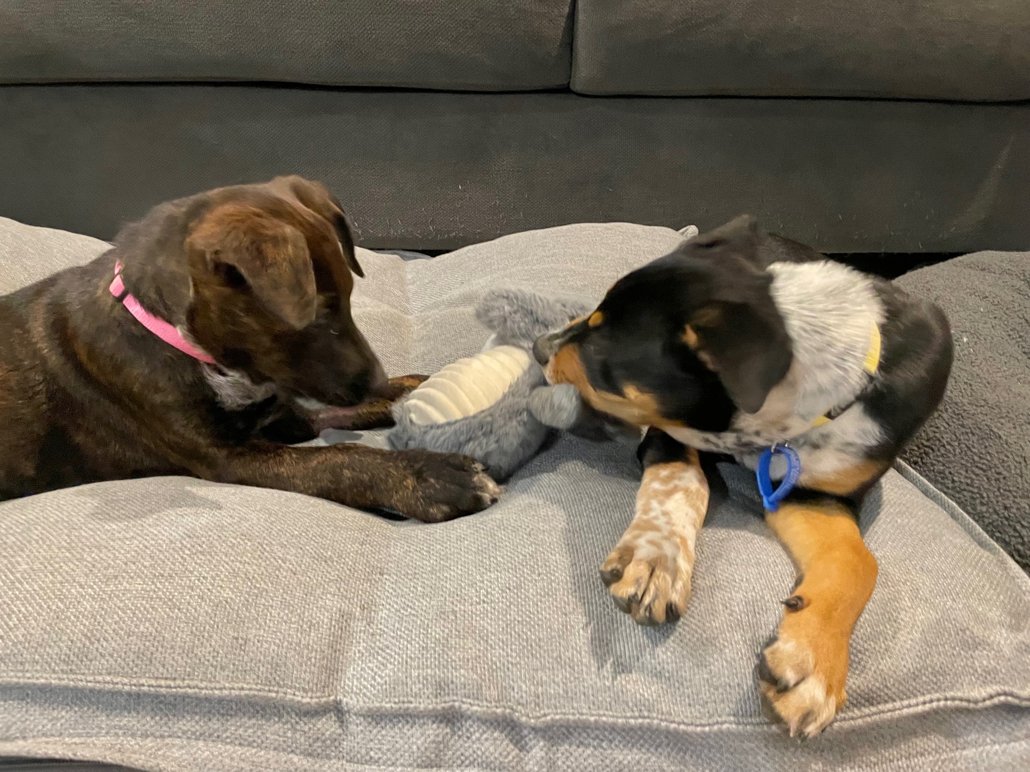 JADE finds reassurance in both humans & other dogs. She regularly “checks in” with me throughout the day before heading back off to play with the other dogs & pups or settling down with a long lasting chew (goat horn or a wood chew being two of her favourites).