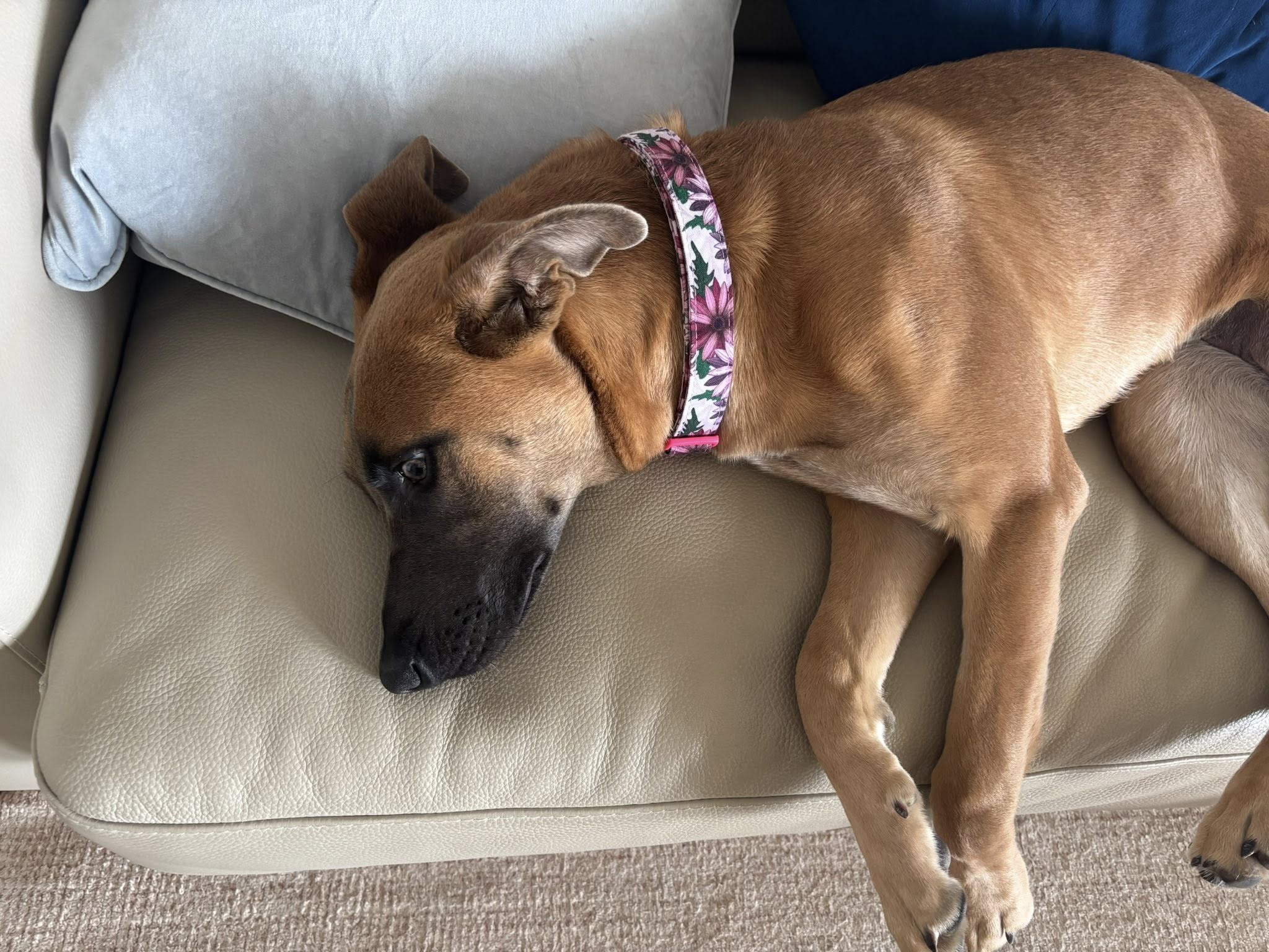 When it’s time to relax, Kona is very happy to join you on the couch. She thinks she passes as a lap dog and enjoys a cuddle, melting into you, before settling beside you.