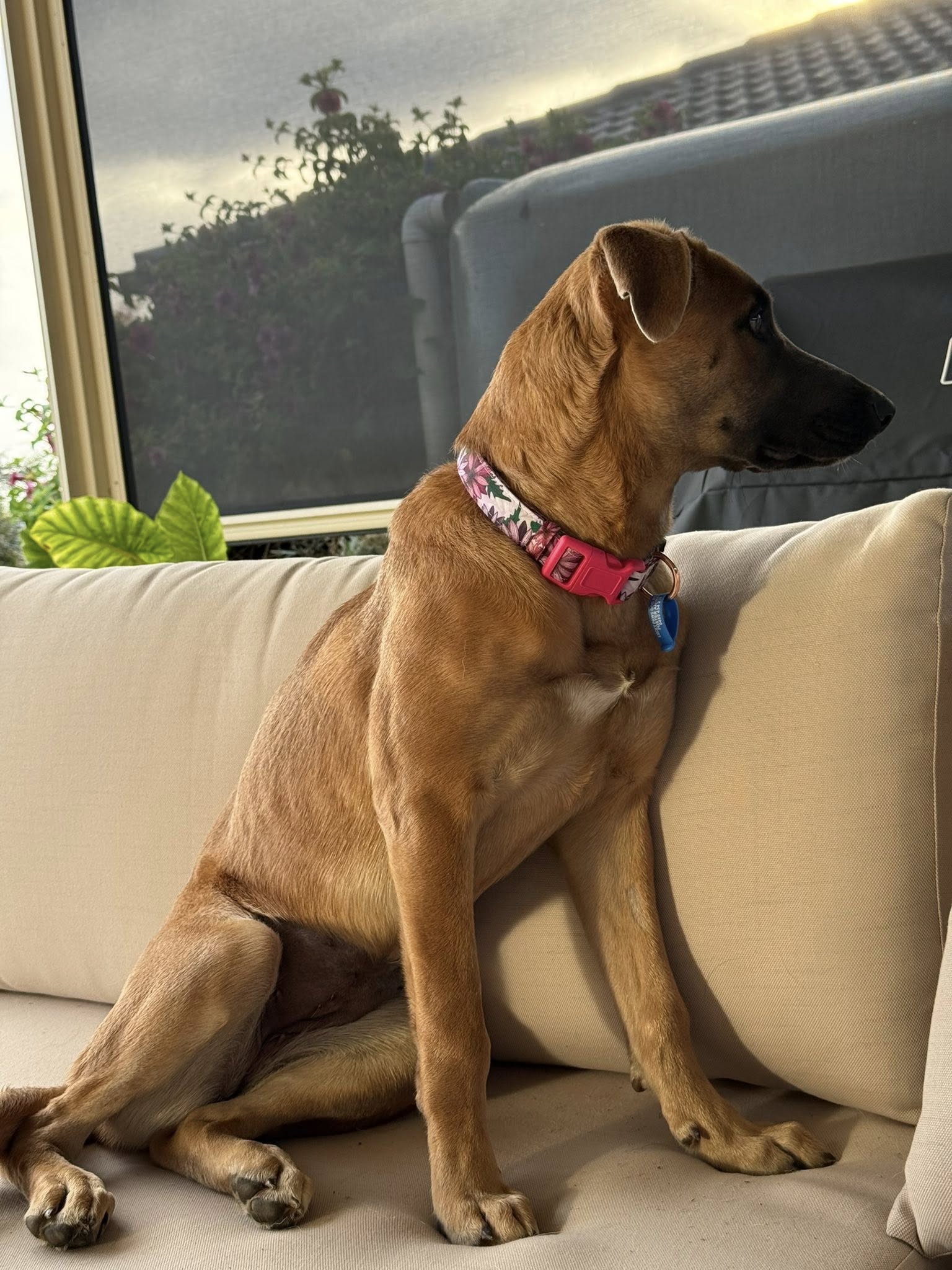 Kona has a super sweet nature and is happiest when she’s close by her human/s, following them around the house, quietly keeping them company as they go about their day. Her eyes are wonderfully expressive and when she’s happy or excited, it starts with the tail wag and ends up being a whole body wiggle.