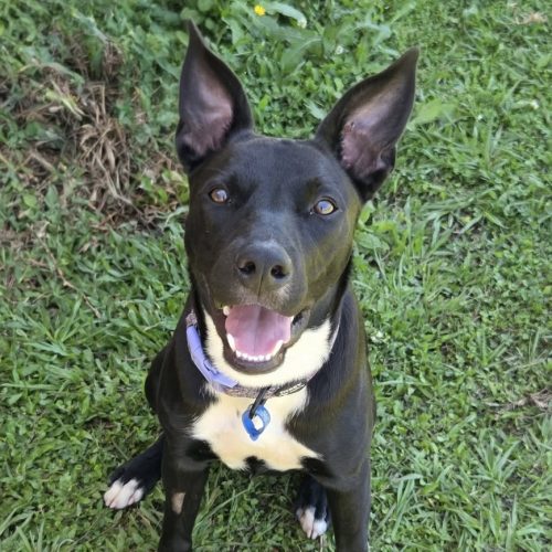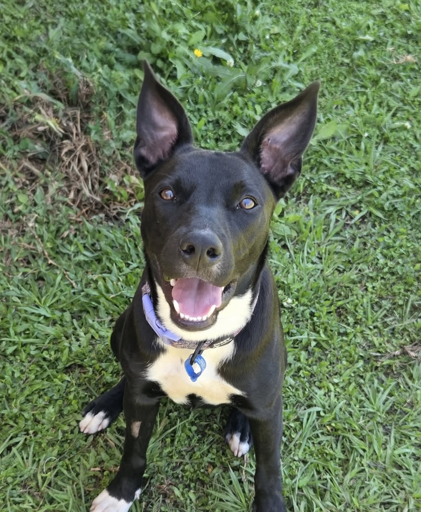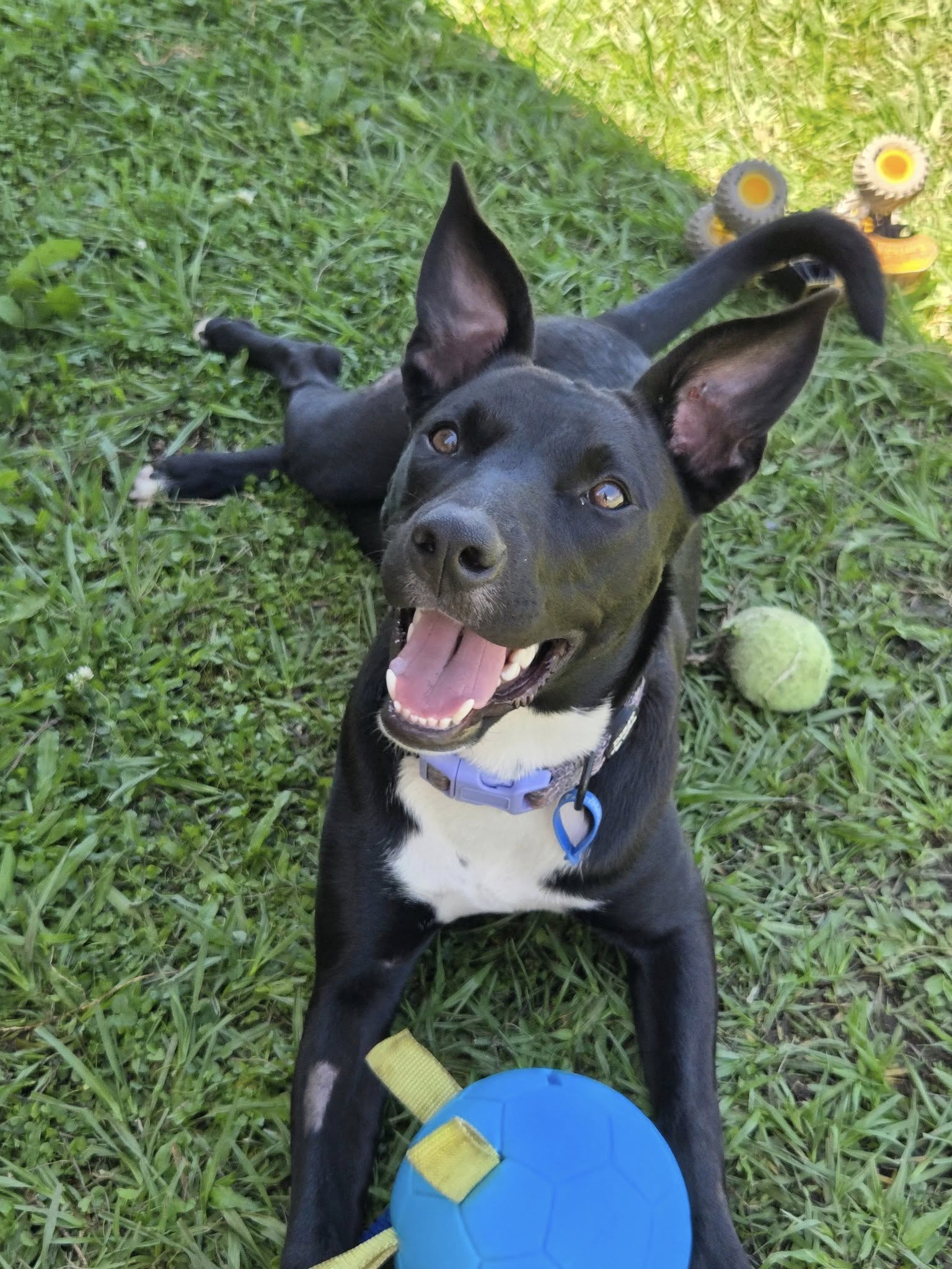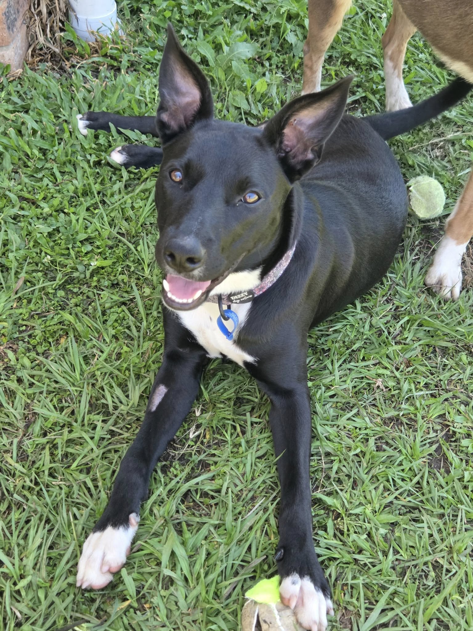 Krumb is full of energy, confidence and smiles! She absolutely loves other dogs and gets along fantastically with both male and female dogs. She would love a home with an active medium/large dog that she can play with.