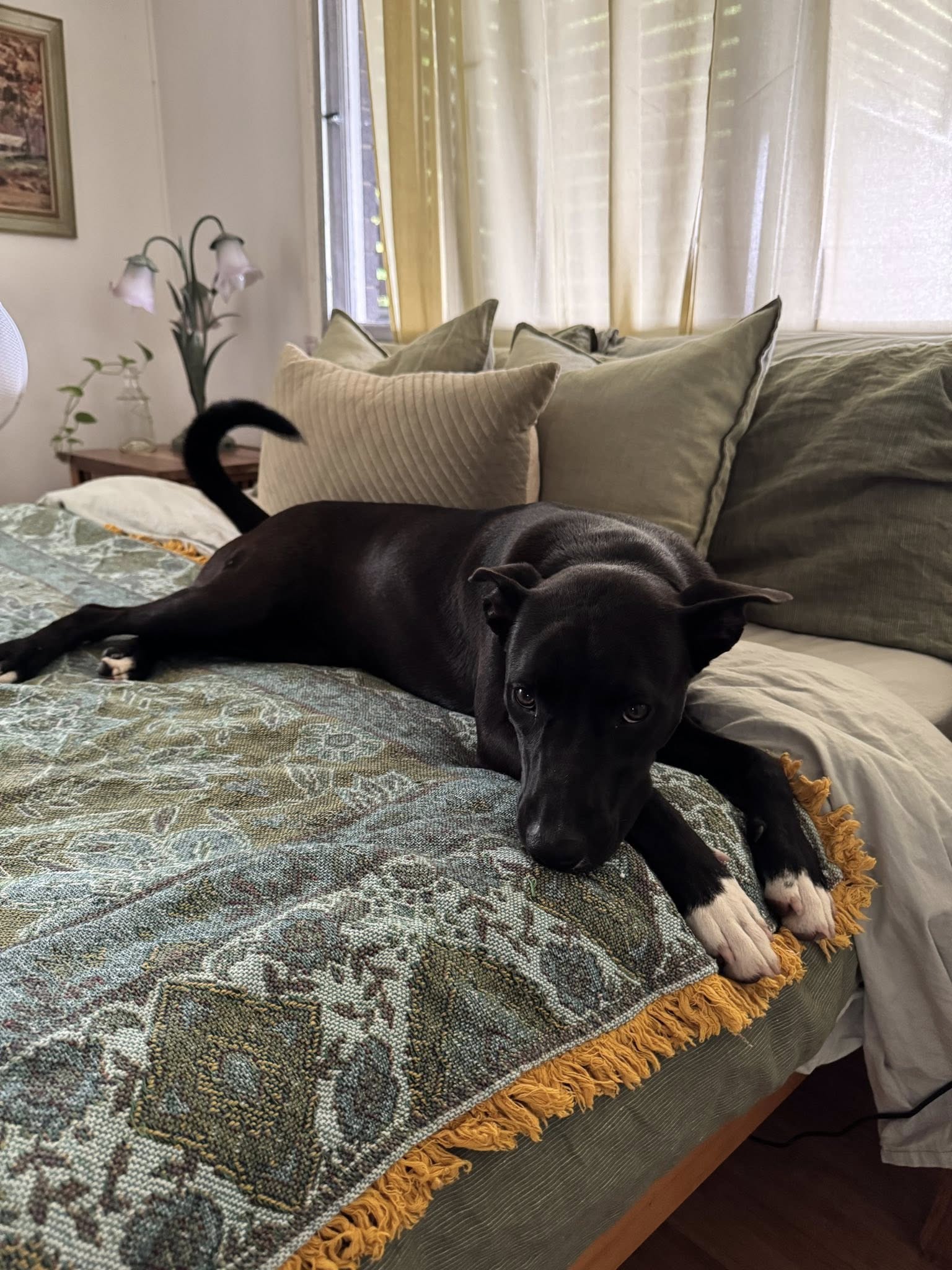 She adores her toys, proudly parading them around the house, teasing her foster brother into chase games. She also knows how to wind down: when she’s not playing, she’s either curled up on the couch or snuggled up next to you.