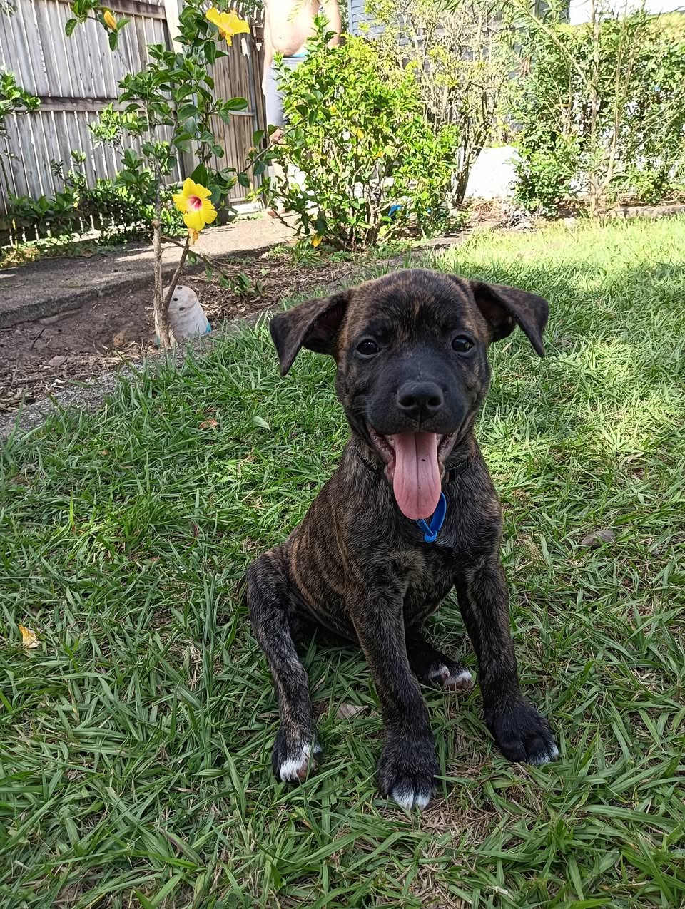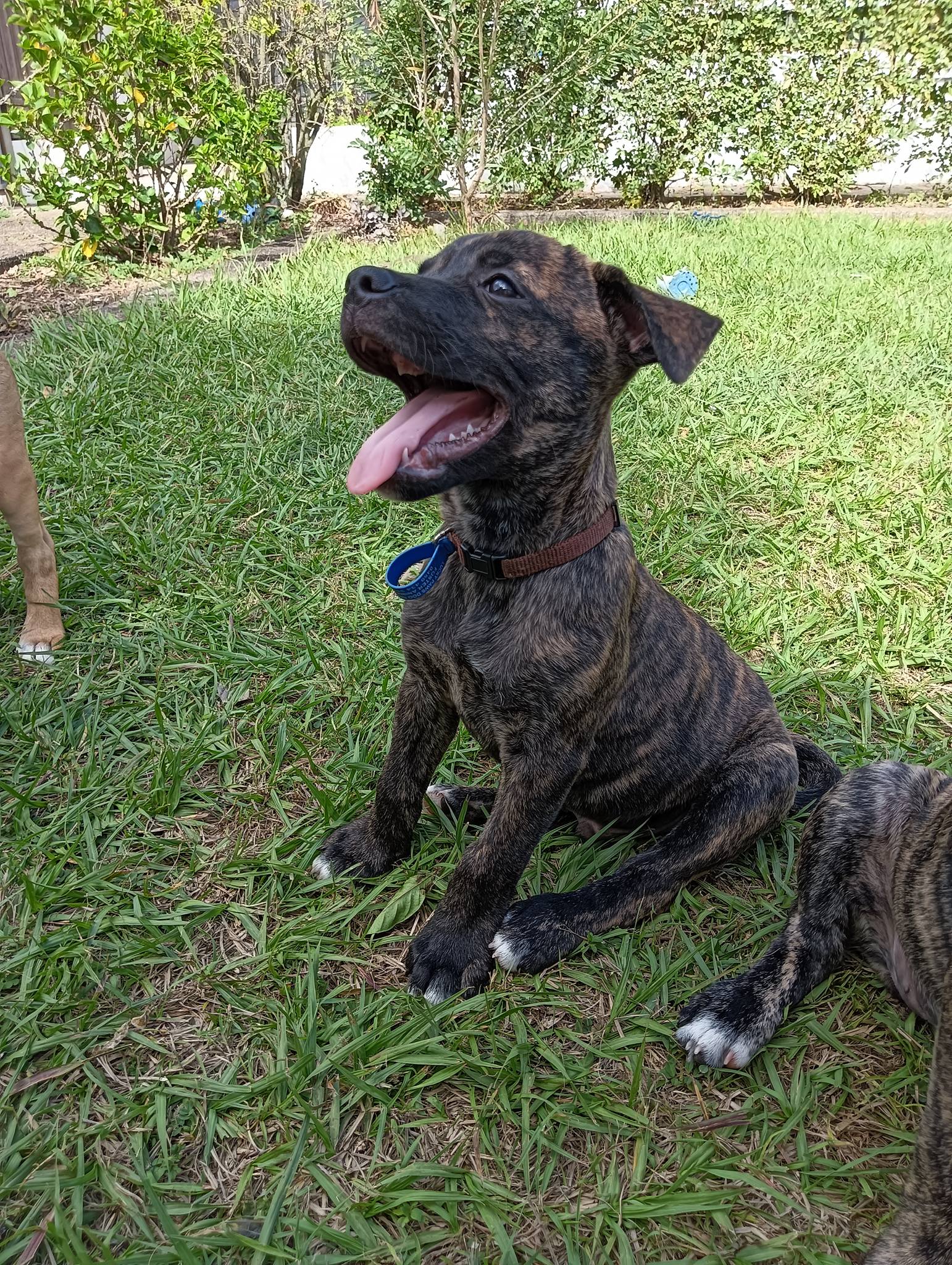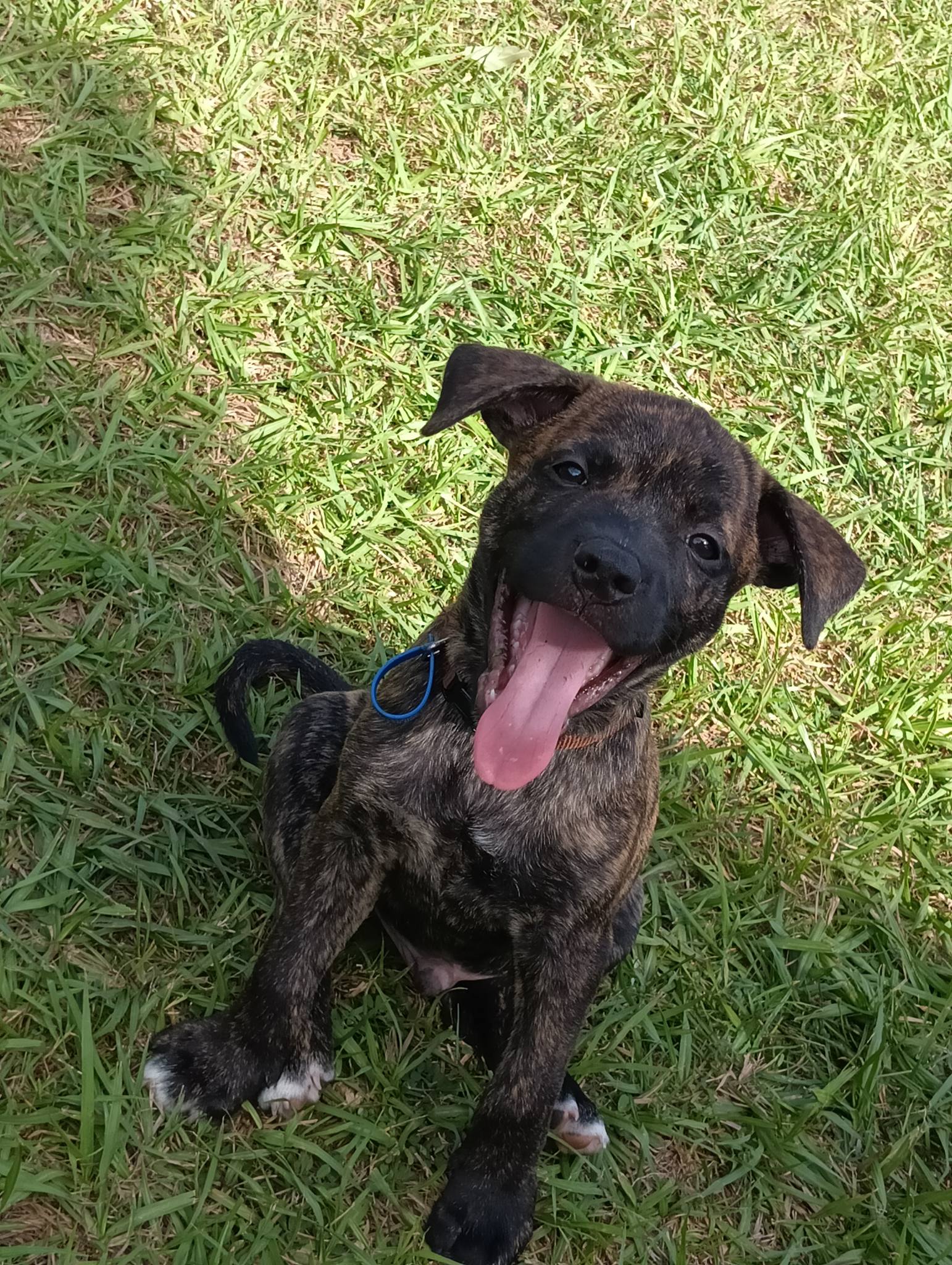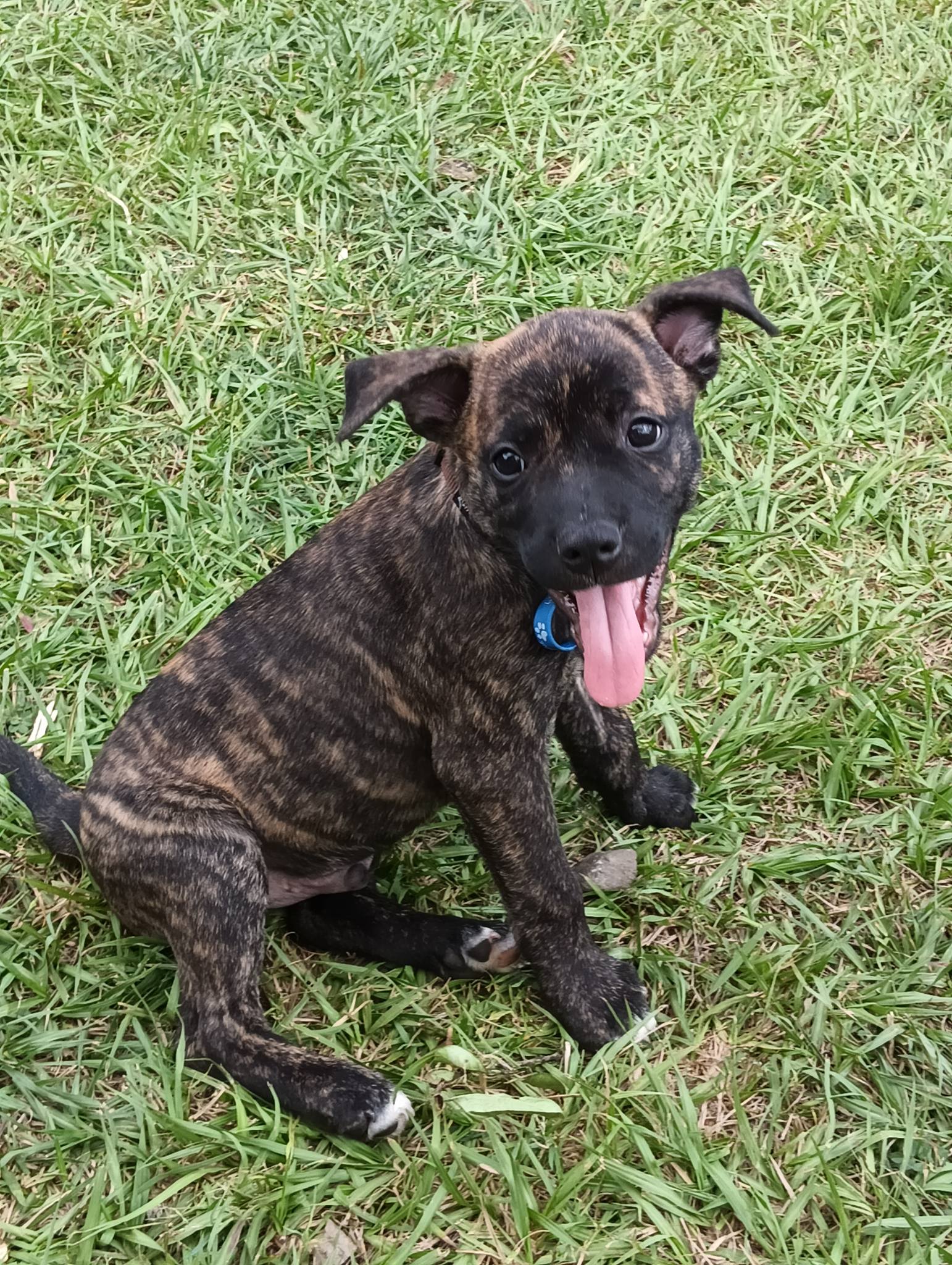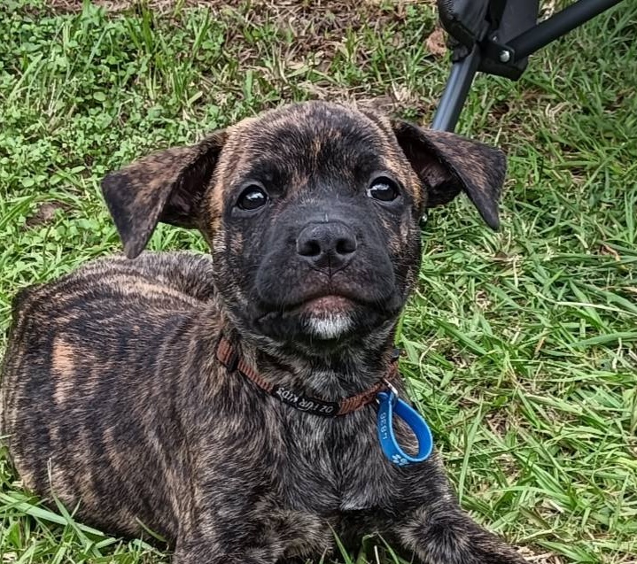 Looking for the perfect piece to complete your family? Meet Lego, a charming 10-week-old male Staffy mix. This handsome brindle boy is a total "sweet pea"—gentle, clever, and full of silly playfulness.