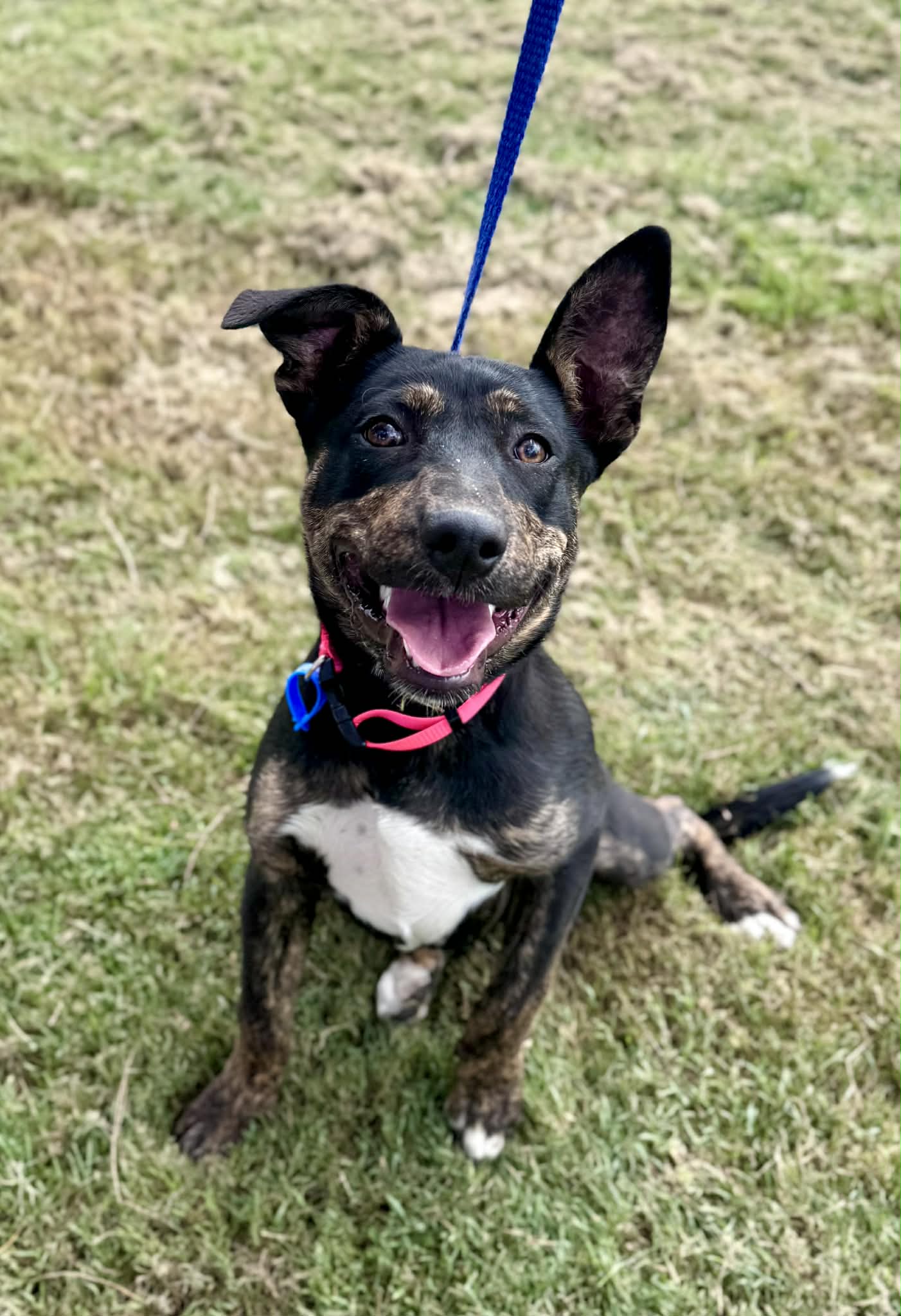 She hasn’t been tested with cats but likely to be fine. While she’s still working on her manners like not jumping or mouthing, she would be best suited to a home with older children.