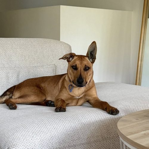 Margot is great with other similar-sized dogs, but she does need a slow, gentle introduction to help her feel comfortable as she can be shy at first. Because she’s still young, excitable, and a bit jumpy at times, she’d be best suited to a home with older kids.