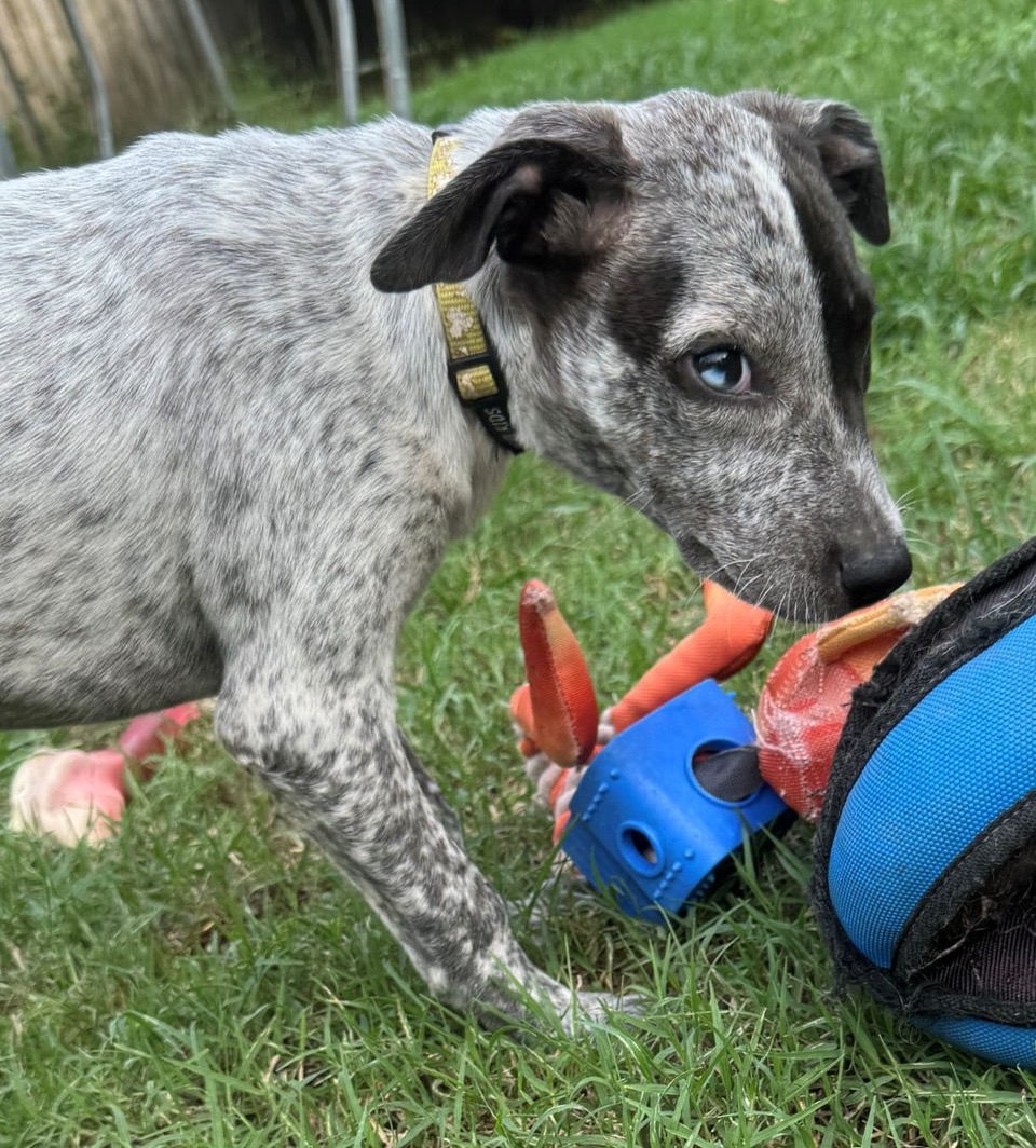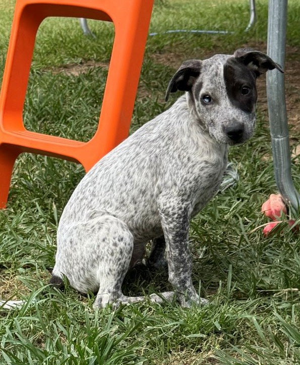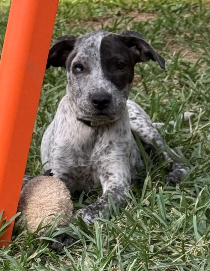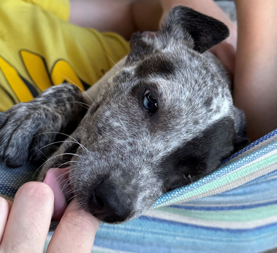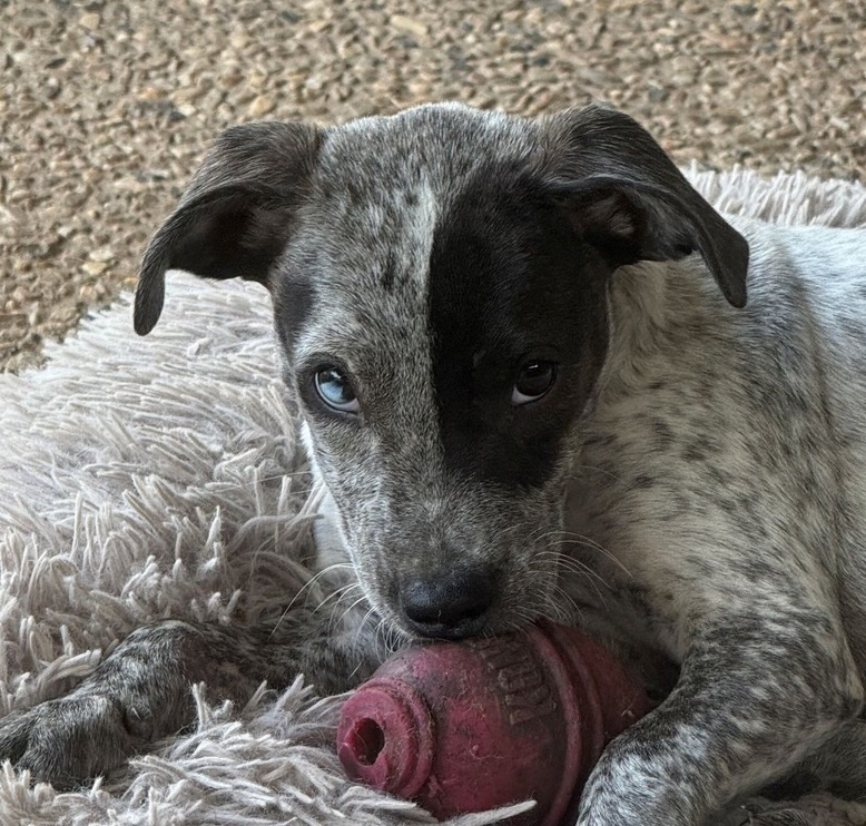 Foster mum and the mini humans tell me that I am really pretty, as do lots of people who have met me. I am unique because I have one blue eye that looks like a marble. Foster mum says out of all the puppies she has had, I am one of her favourite because I am so well balanced. I am not clingy, but I do like a cuddle, so I am a lovely mix. I like playing with my fur foster siblings, but I also don’t mind being on my own for a while. I am a smart girl with medium energy, so after playing I will need a nap. I am amazing overnight and will sleep without waking you up.