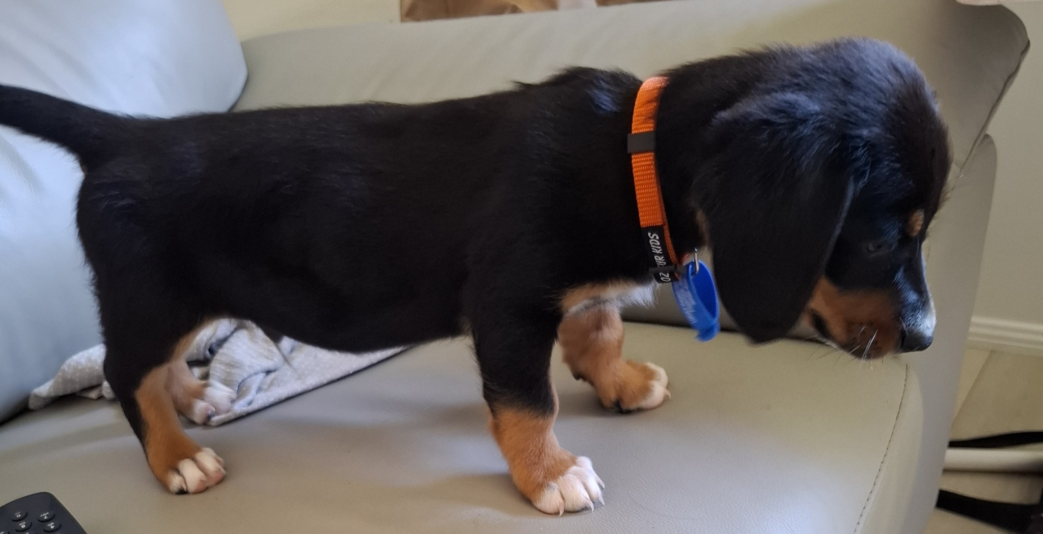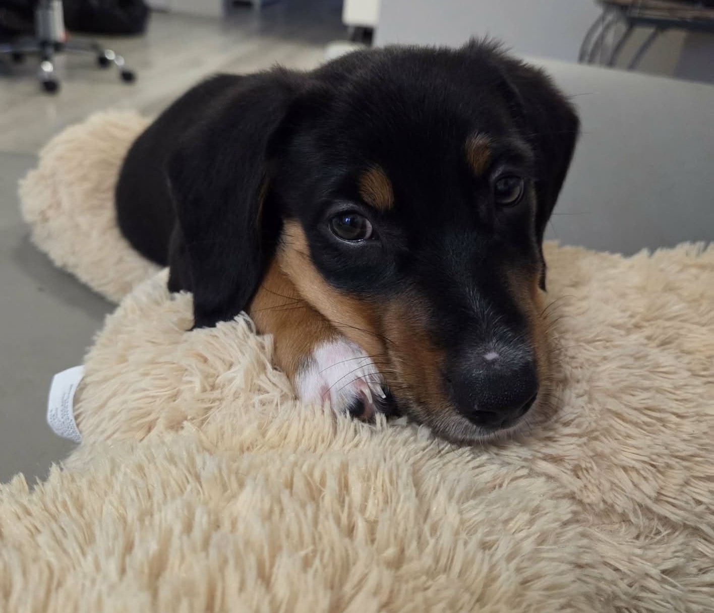 He will cuddle up to you or a fluffy toy and nap when you watch TV. He sleeps in a pen at night and is still learning to settle but then will sleep through until morning. He is doing well using the puppy pads with only the occasional accident.