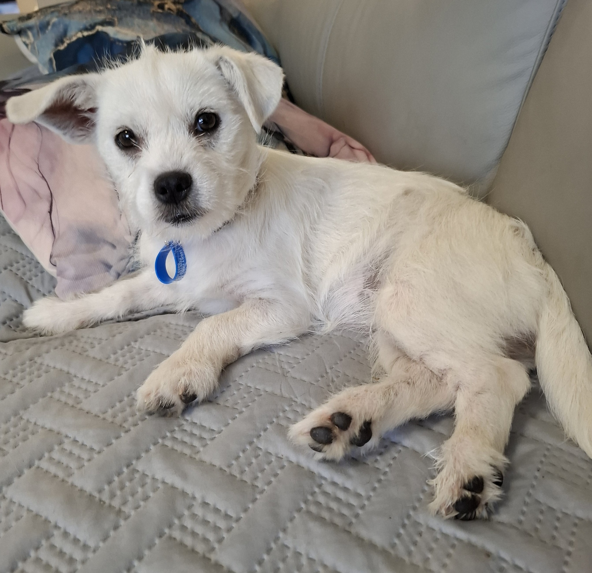 While she may be initially timid, she becomes calm and relaxed once she is comfortable in her environment. She plays well with other dogs in the household and wrestles and races them when they get the zoomies.