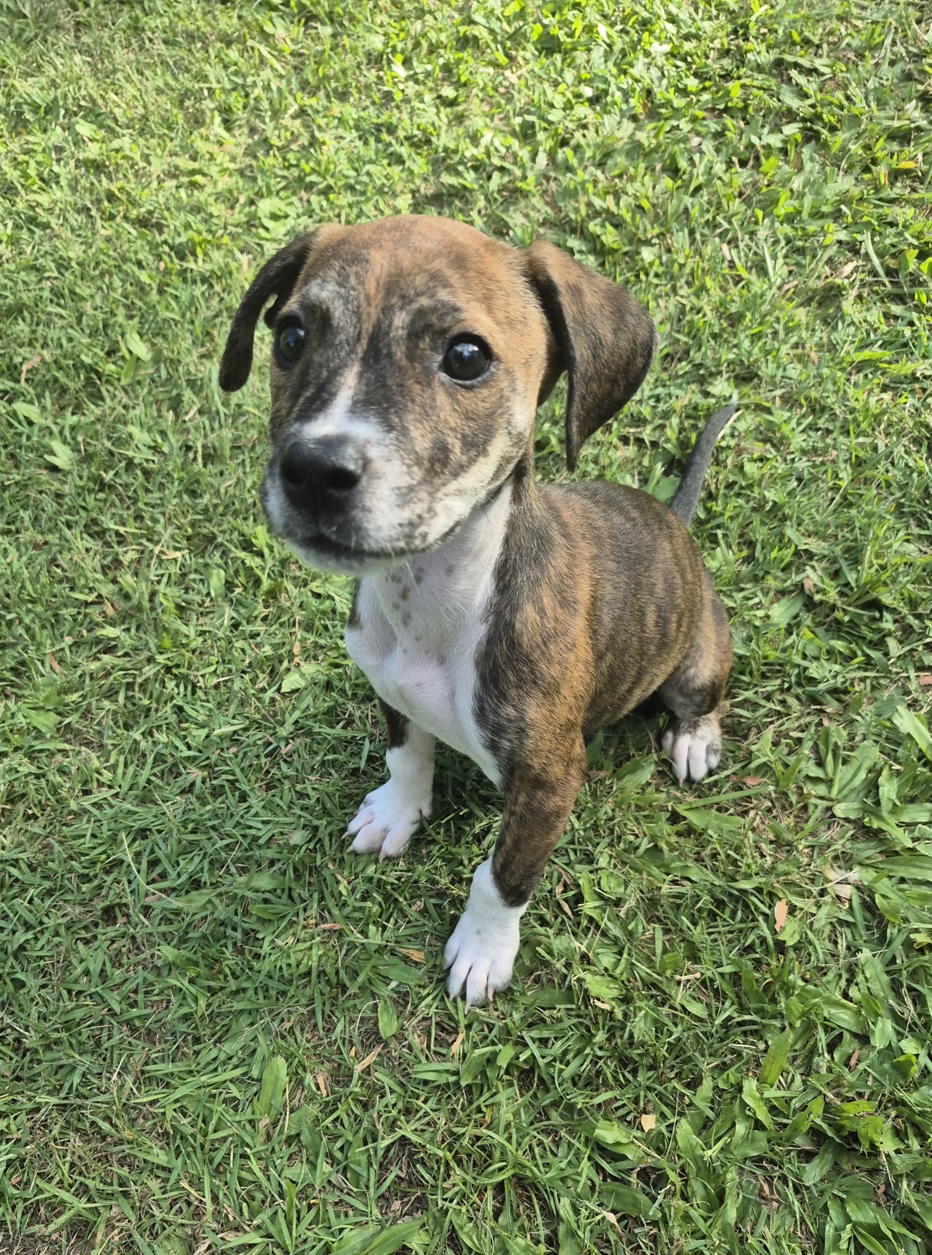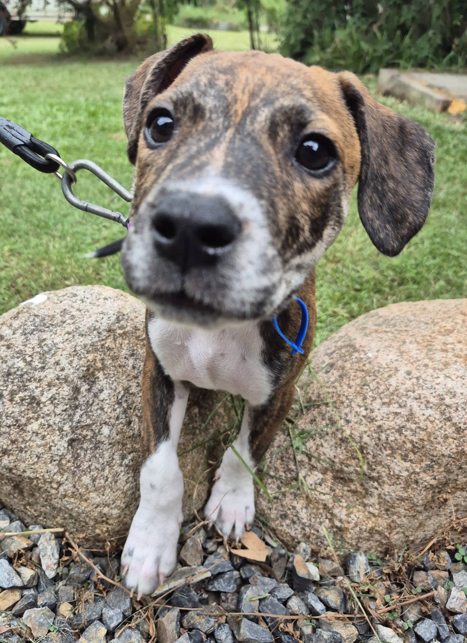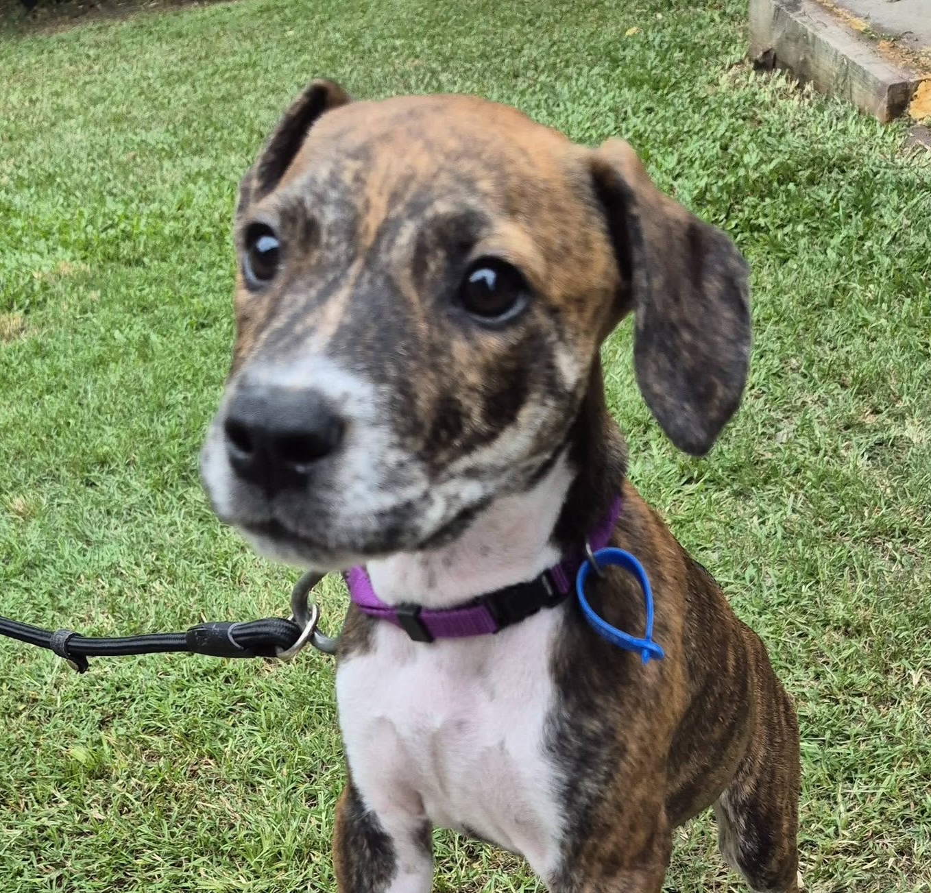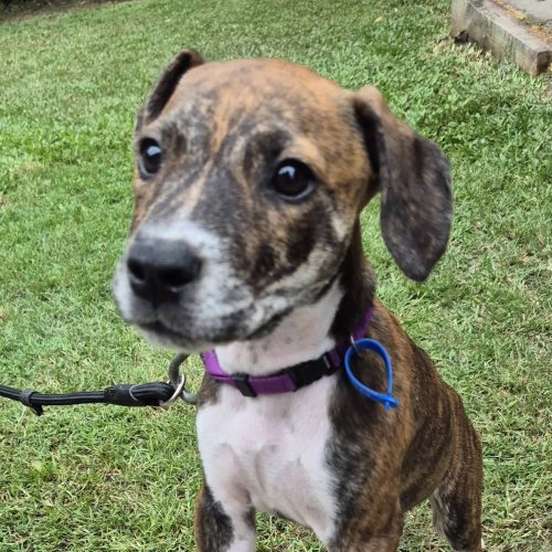 She is very food driven and trainable. She has learnt to sit already but gets distracted by other dogs so may need to be trained individually first.
