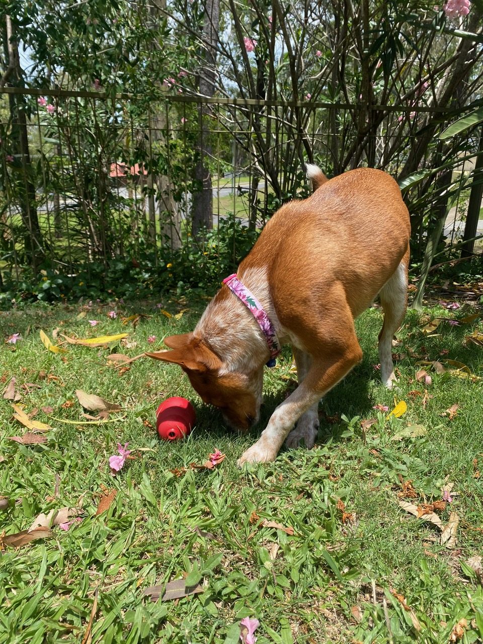 Reba is great with medium/large dogs that are playful. Reba has boundless energy and could play all day! She is strong and can be a bit enthusiastic when playing, so she is not suitable for smaller dogs. She loves enrichment toys and activities to keep her mind busy.