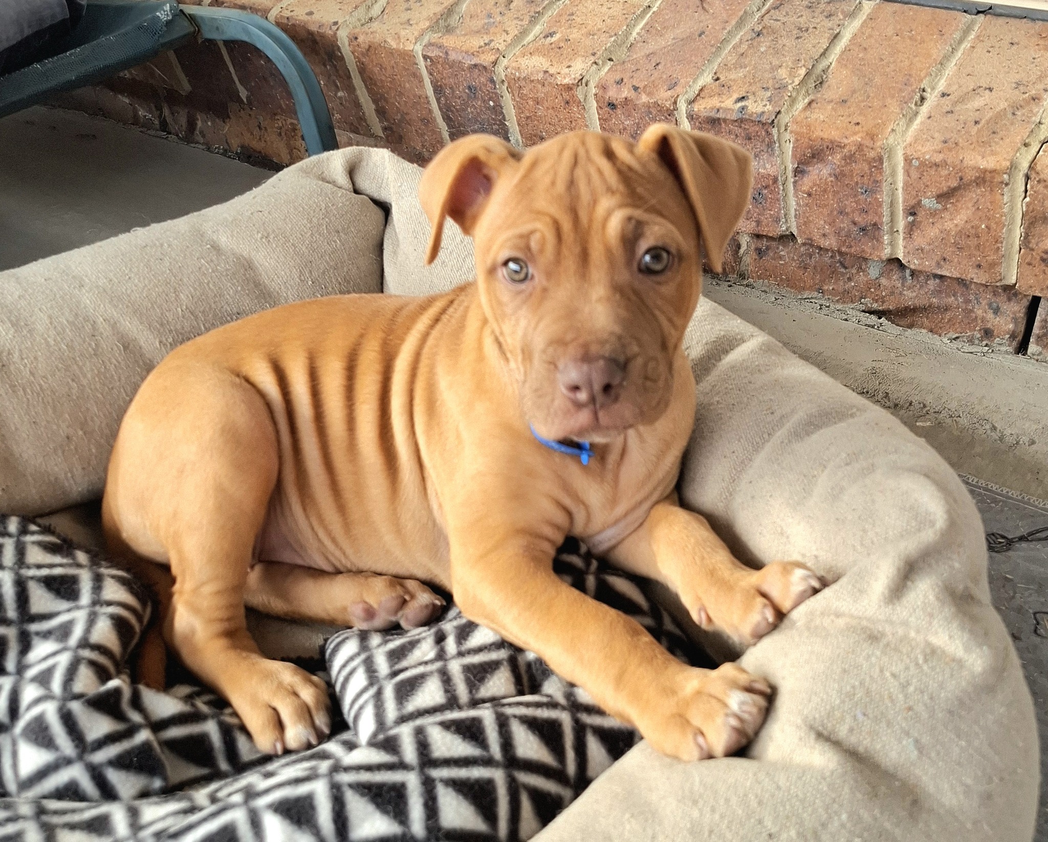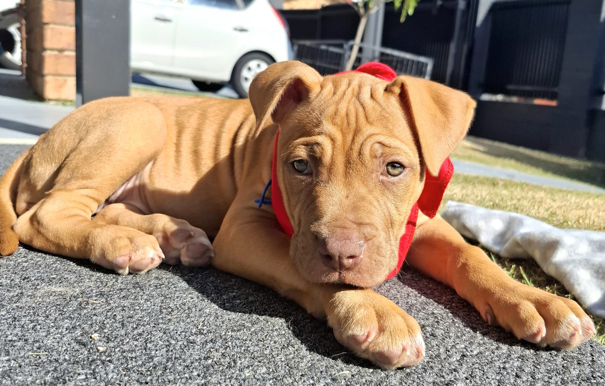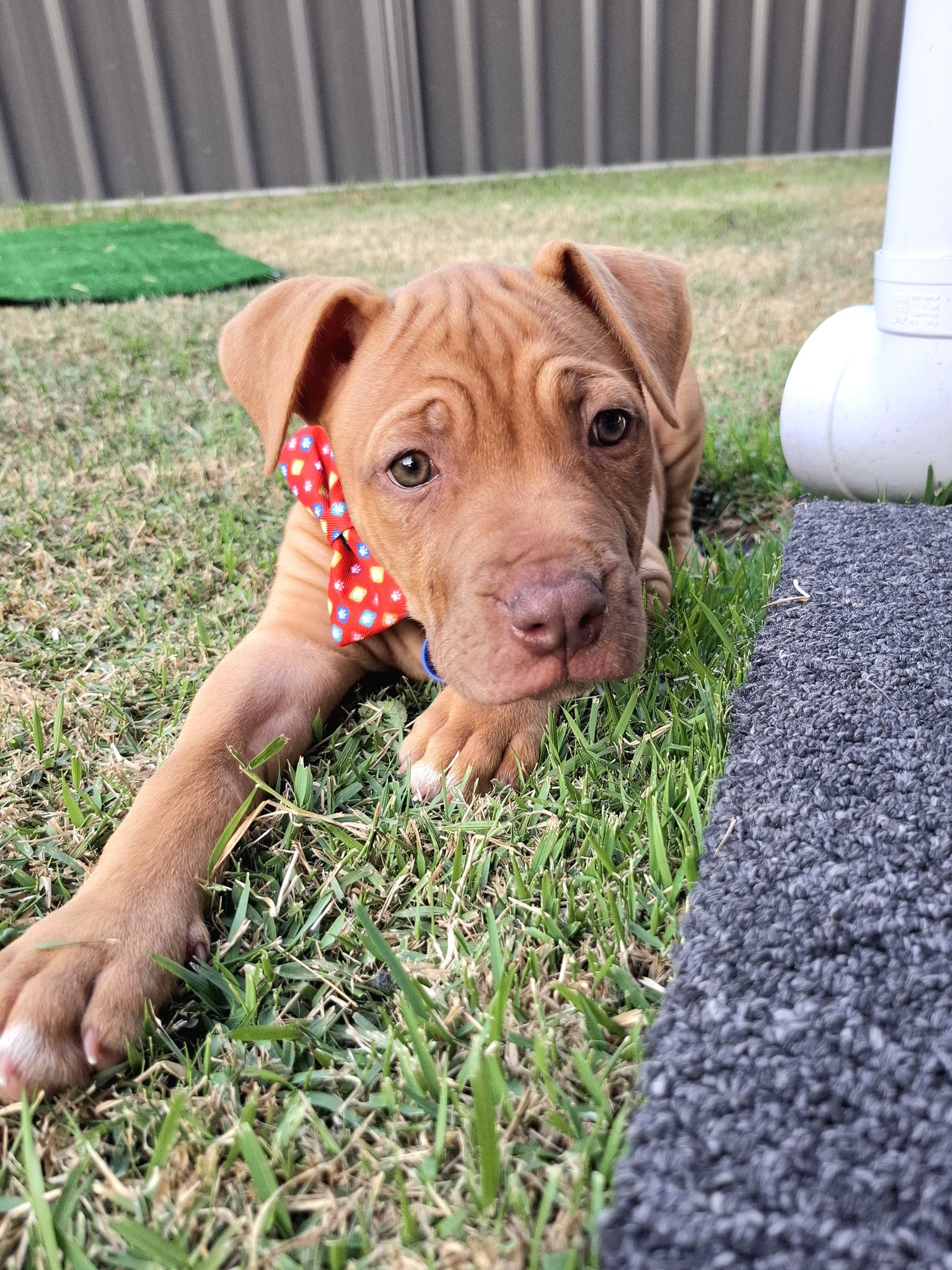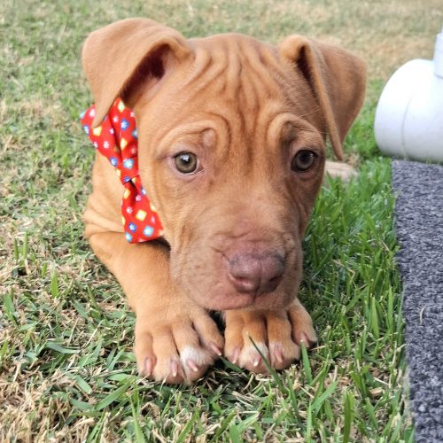 As a Mastiff x Staffy, Rocher will mature into a medium-to-large sized dog, so she’ll do best with a family who can give her plenty of love, guidance, and training as she grows.