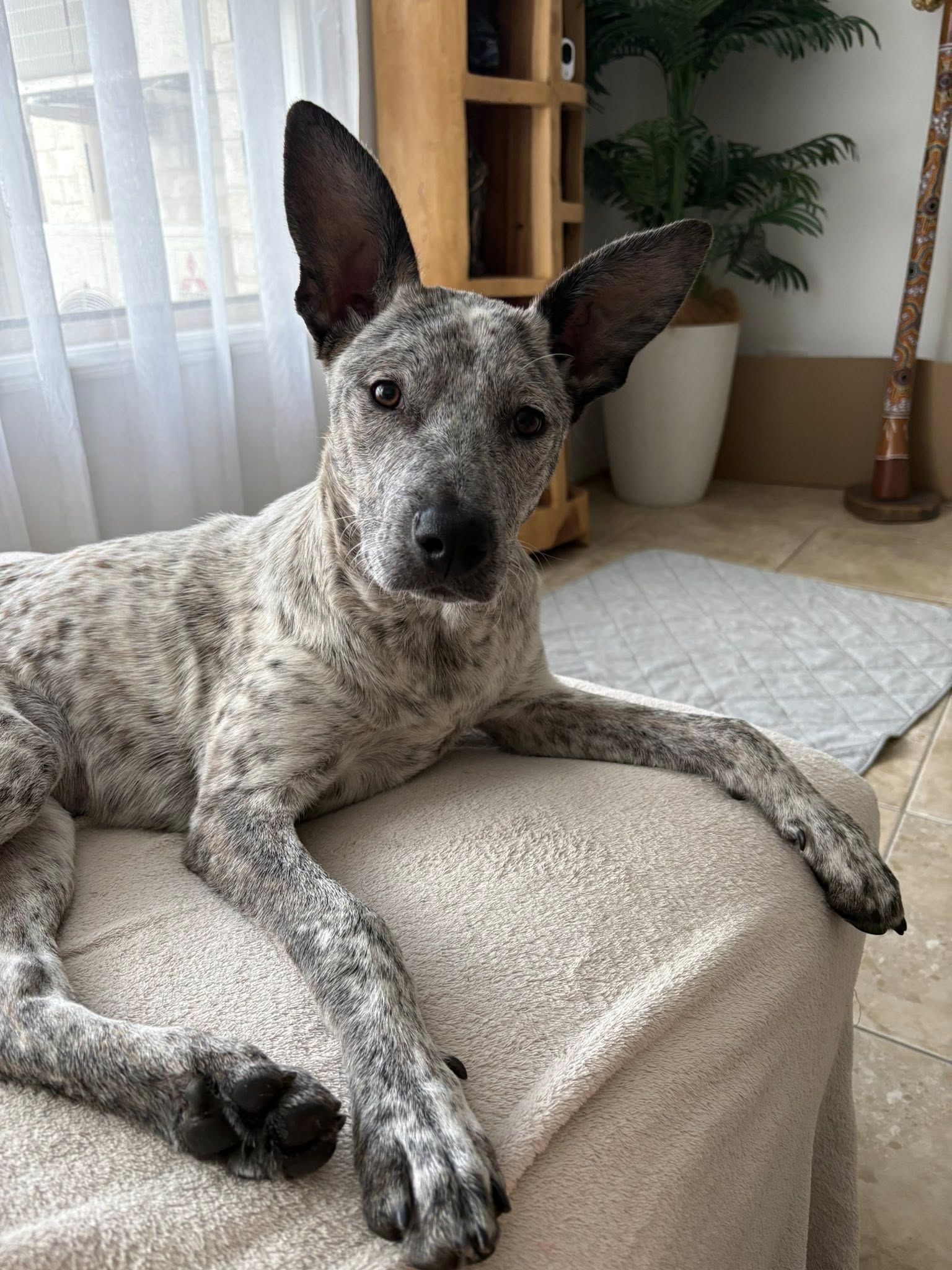 Trixie is toilet trained. At night she sleeps on her bed on the floor next to her parents’ bed and is mostly a sound sleeper, she will let you know if she needs to go outside. She weighs 15 kilos at the moment and will probably be on a smaller side.