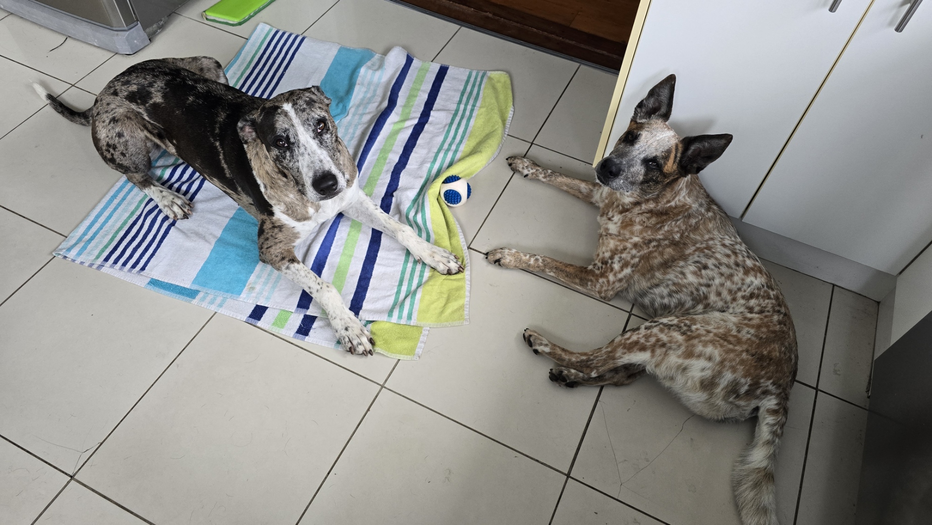 She has shown some on-leash reactivity toward other dogs in the past, though this has been steadily improving. With slow, thoughtful introductions, she does well with both small and large dogs. She has settled in beautifully with her ball-loving foster brother, and she also shares the house with two cat foster siblings - while she is naturally keen to chase them, she has been making great progress with impulse control and can now approach them calmly (though supervision is still required).