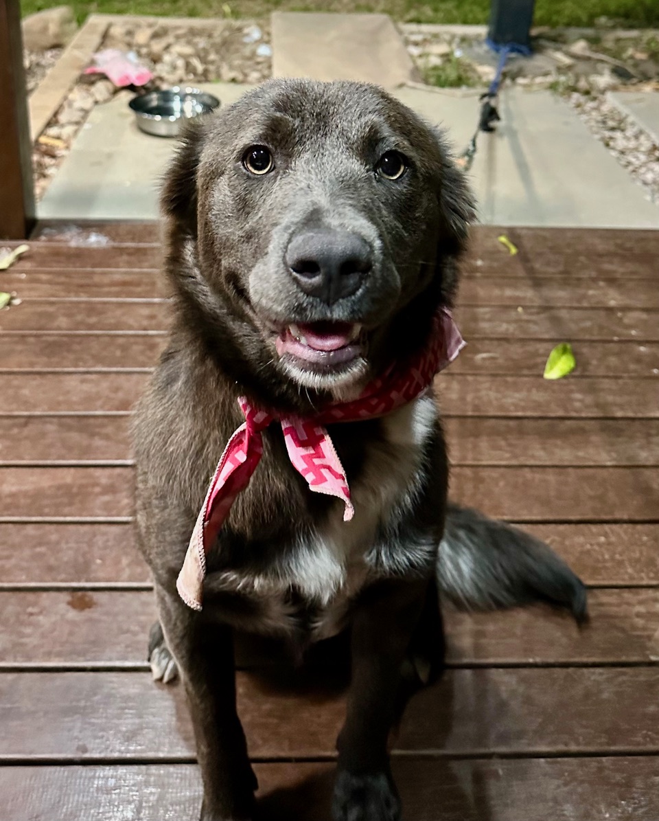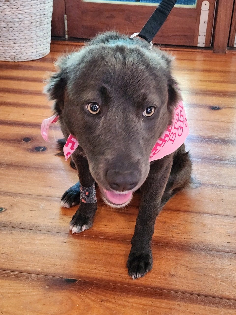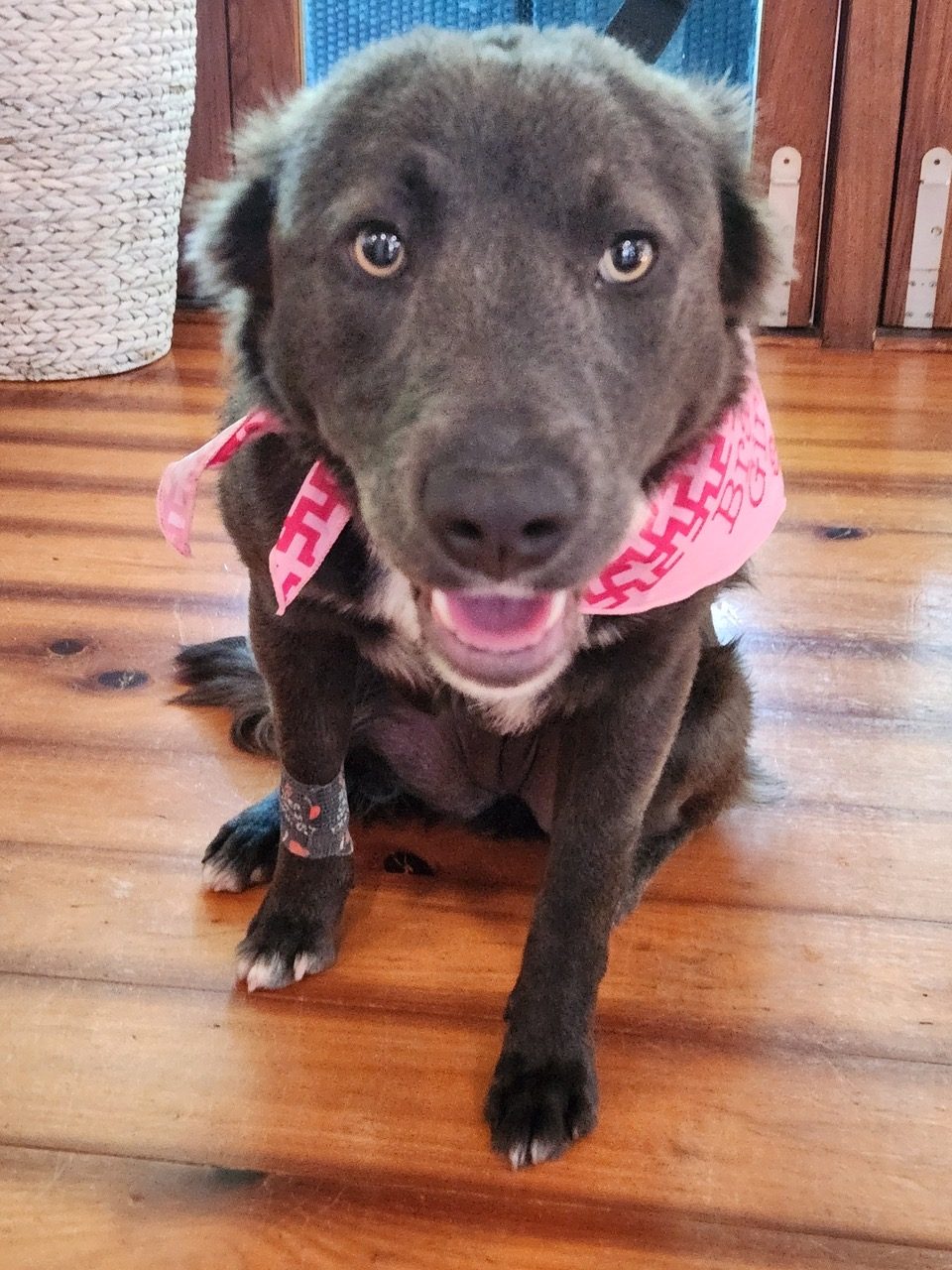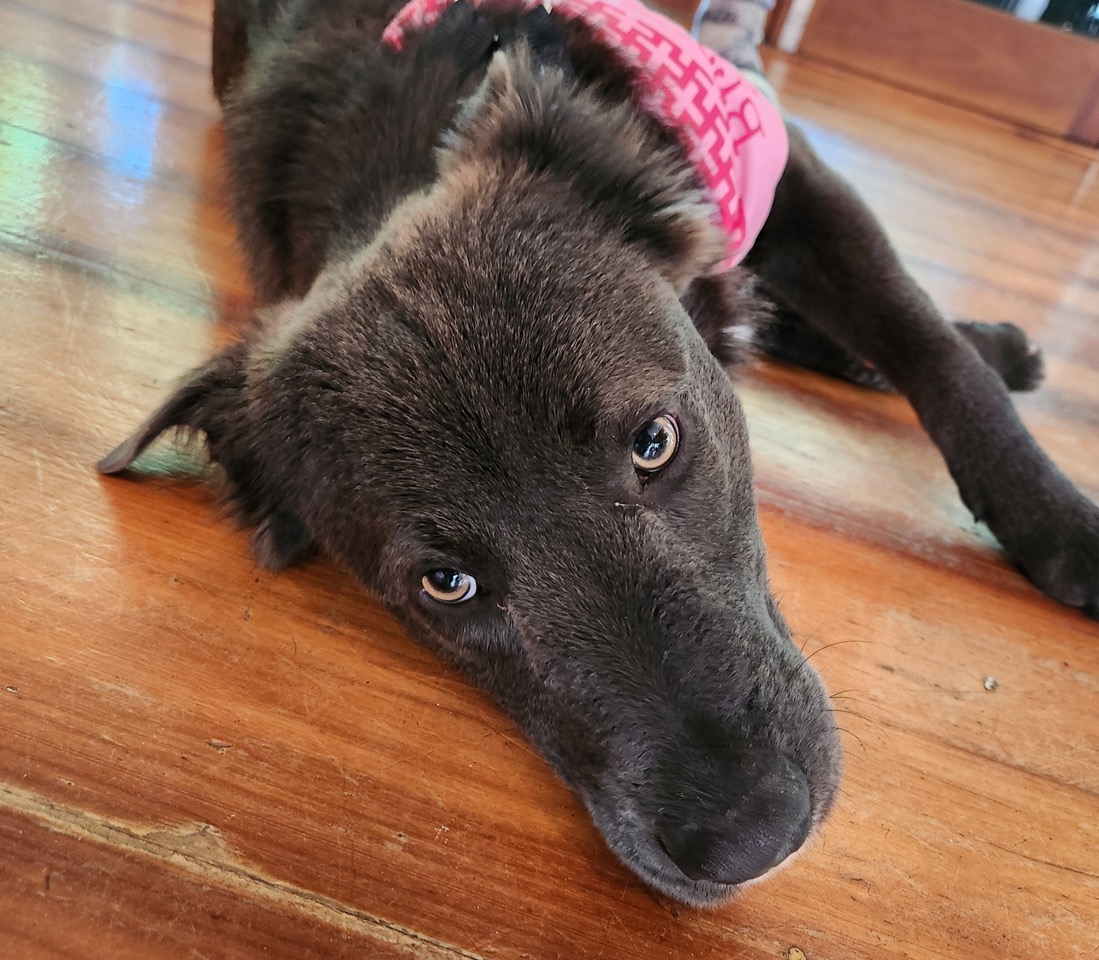 She has mastered "sit" and "on your bed" and "down” but needs more training to learn "off" because she wants all the love. Her toilet training is coming along well and she learns quickly, proven by her conquering her own reflection!
