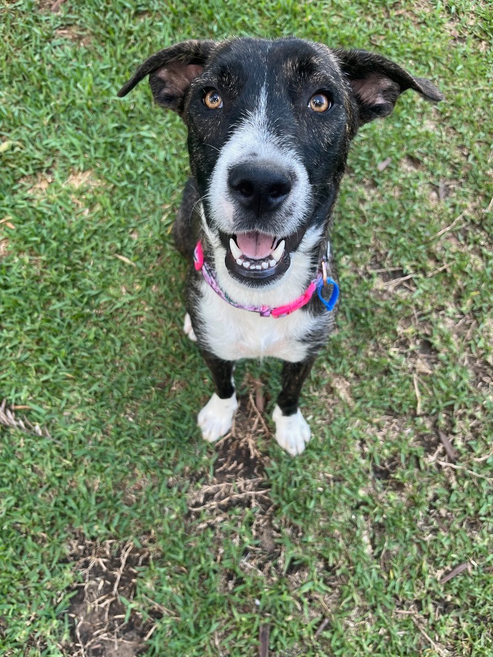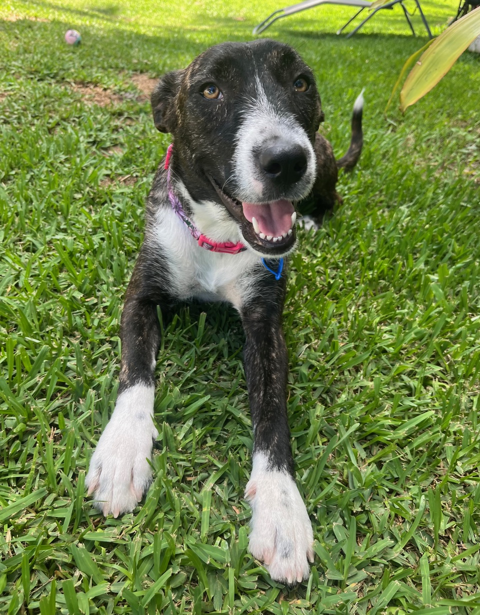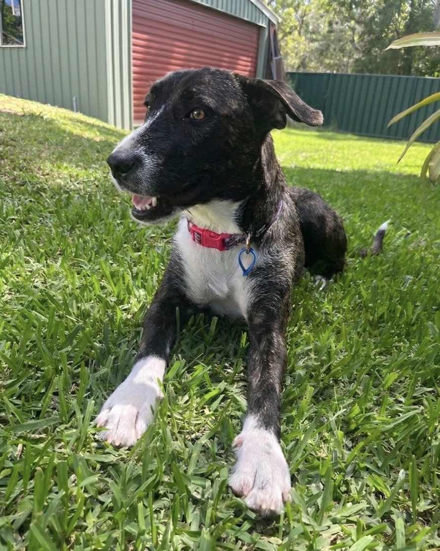 When I’m not snuggling up to you I like to be out in the yard running around with my 2 foster siblings.  Toys are still new to me but I’m keen to chase a ball and play in water. I even like my cat friend - though they aren’t really interested in playing. I love to play with kids and run around with them. Once I’m tired out from running around I like to sit and observe what’s happening around me in the afternoon sun.